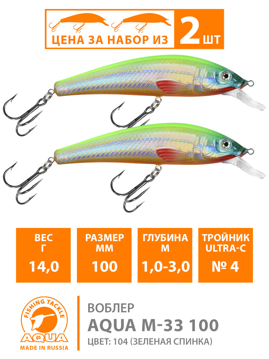 Воблер для рыбалки AQUA M-33 100mm, вес - 14,0g, цвет 104 (зеленая спинка) (набор 2 шт)