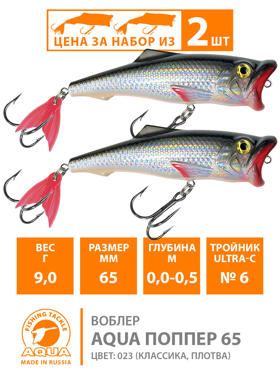 ПОППЕР для рыбалки AQUA 65mm, вес - 9,0g, цвет 023 (классика, плотва) (набор 2 шт)