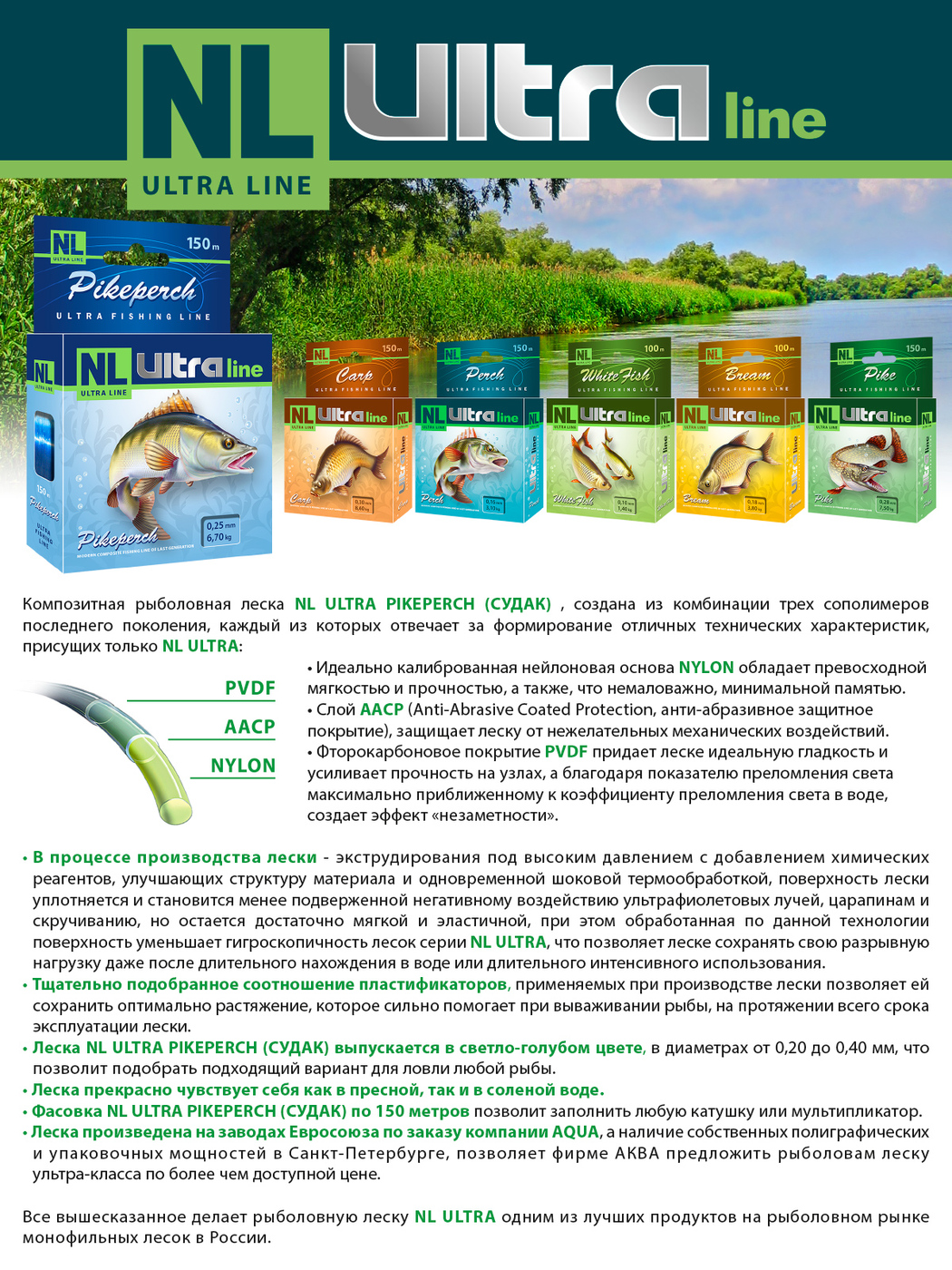 Монофильная леска для рыбалки Aqua NL ULTRA PIKEPERCH (Судак) набор, 2 шт. по 150 м; 0.4 мм