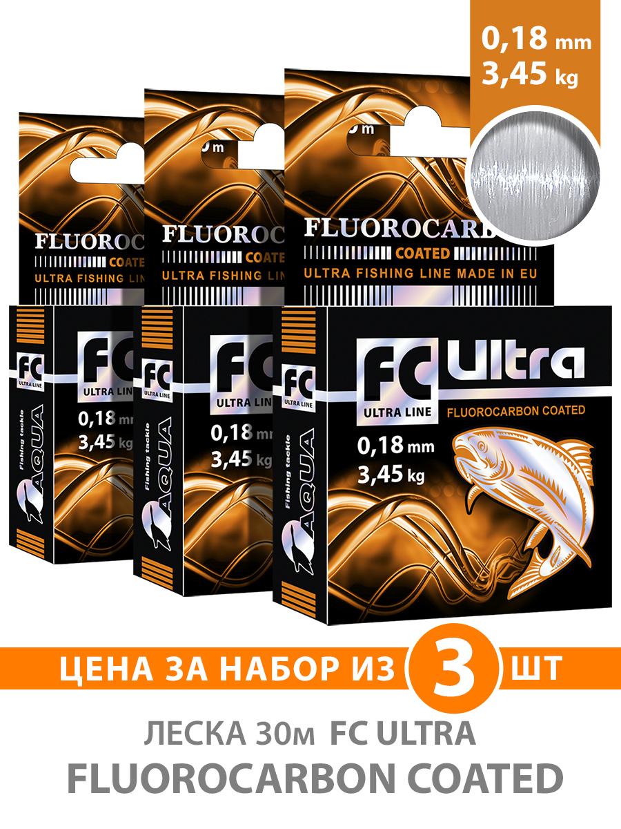 Монофильная леска для рыбалки Aqua FC ULTRA Fluorocarbon Coated, 3 шт. по 30 м; 0.18 мм