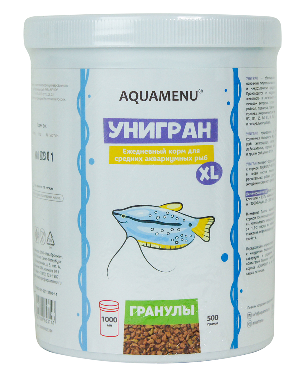 Корм для рыб AQUAMENU "Унигран XL" для средних аквариумных рыб, 1000 мл (500 г.)