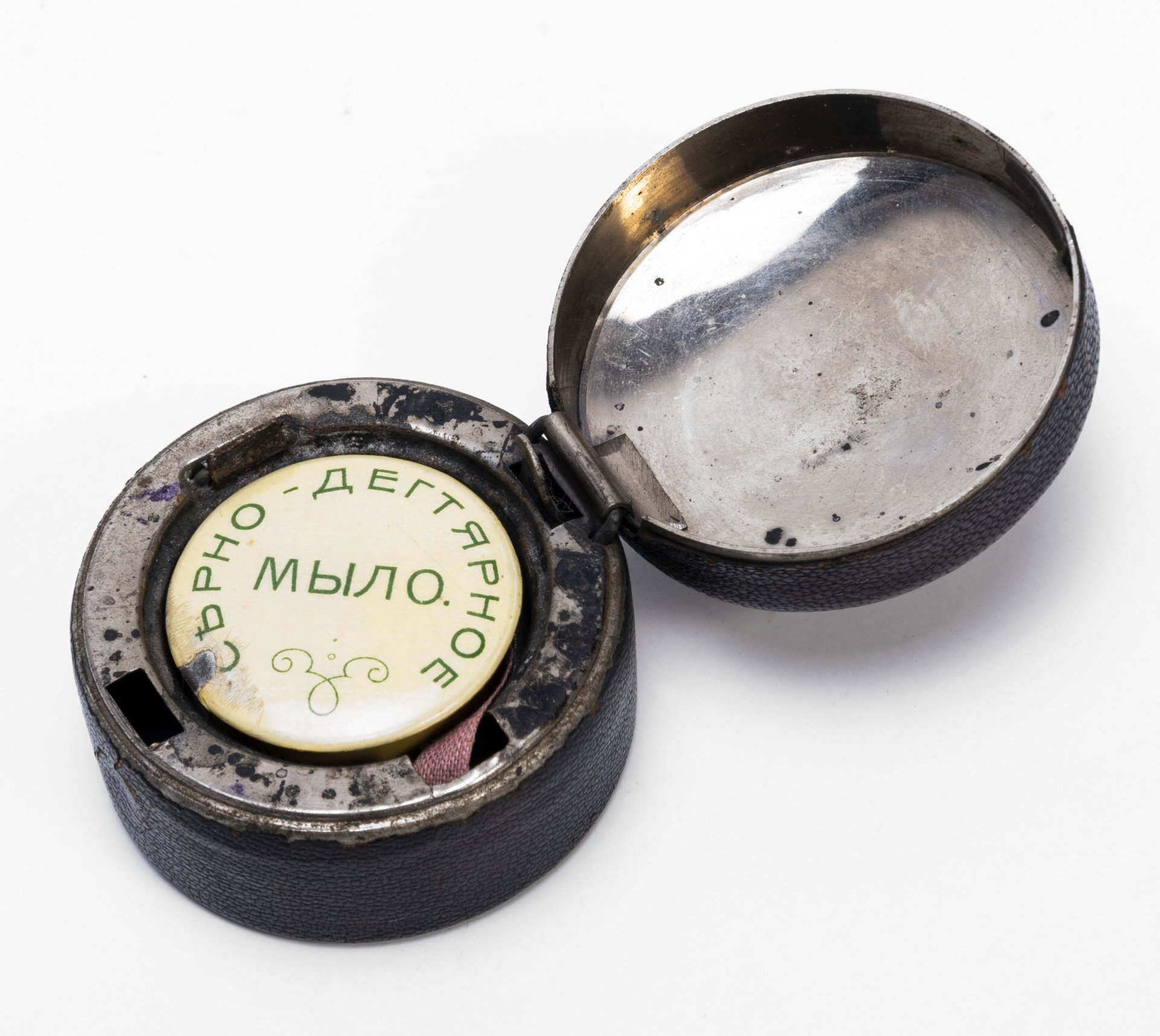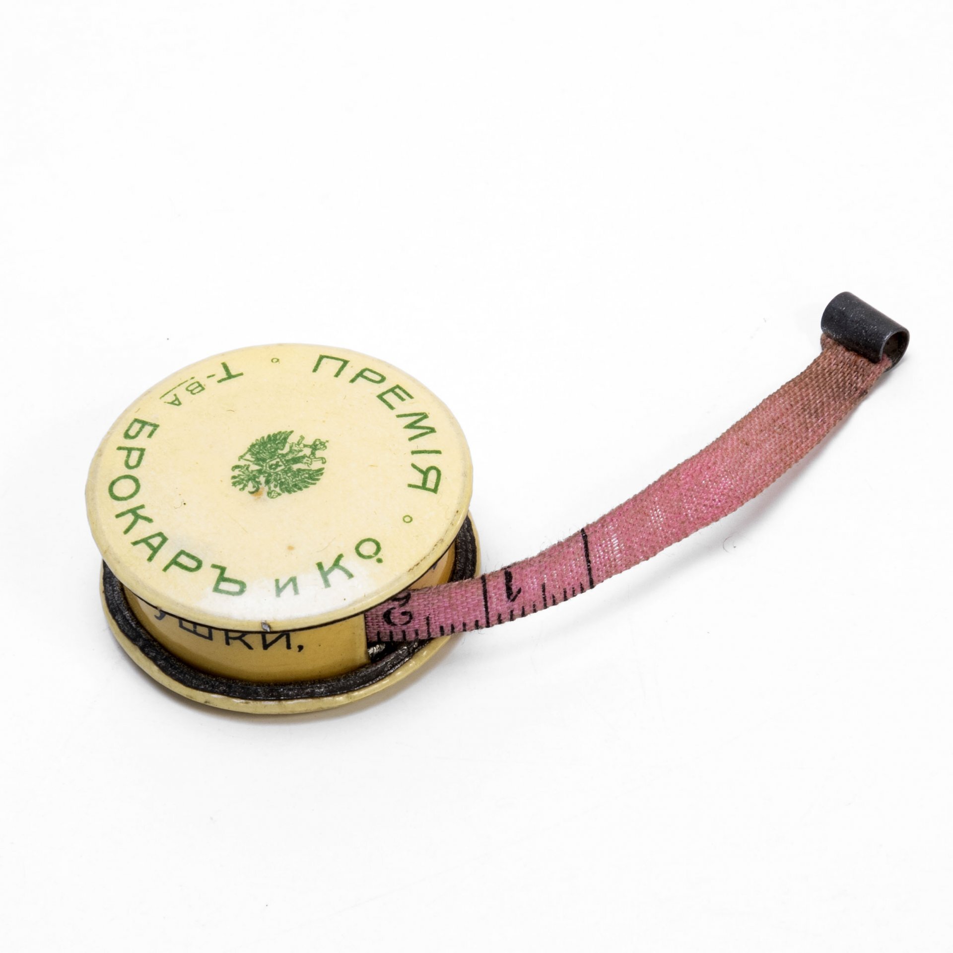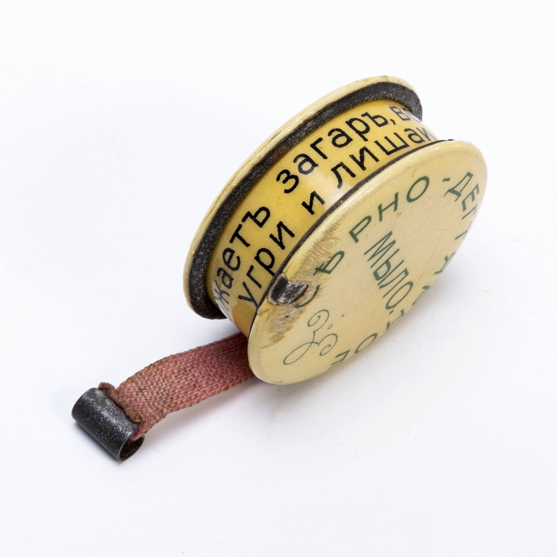 Рулетка с рекламой мыла в футляре, металл, ткань, кожа, Российская империя, 1900-1910 гг.