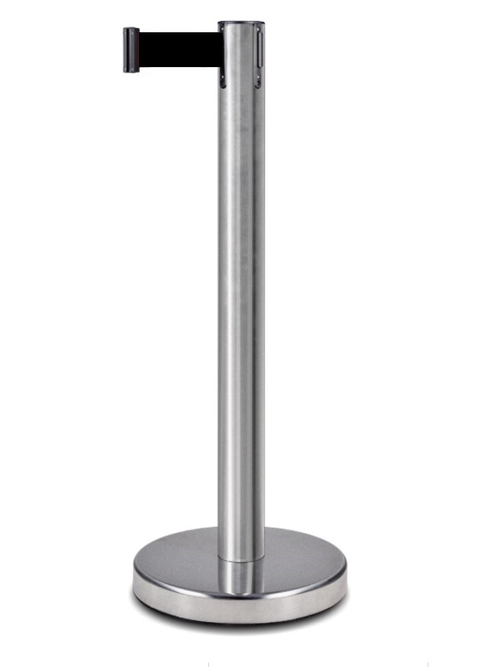 Мобильная стойка ограждения с вытяжной черной лентой 5м