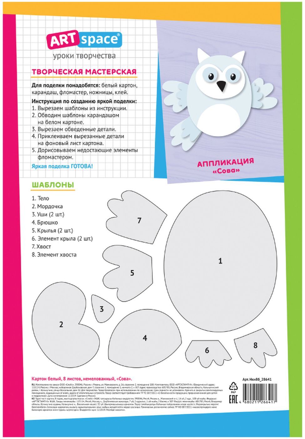 Картон ArtSpace Сова, немелованный, в папке, 290856, белый, 8 листов х 25 шт