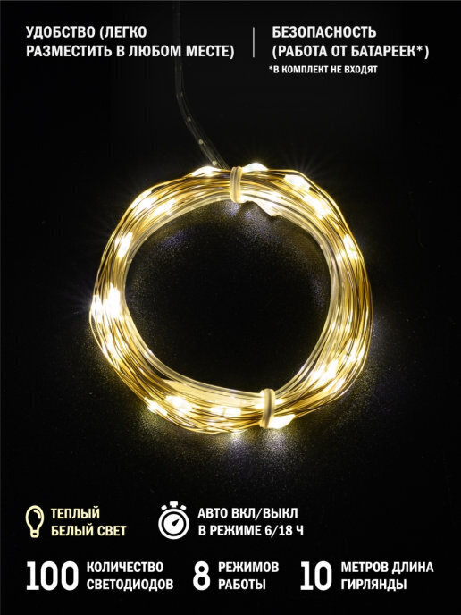 Электрогирлянда интерьерная Нить ARTSTYLE Светодиодная 10 ламп, 10 м, питание 3 AA, 1 шт