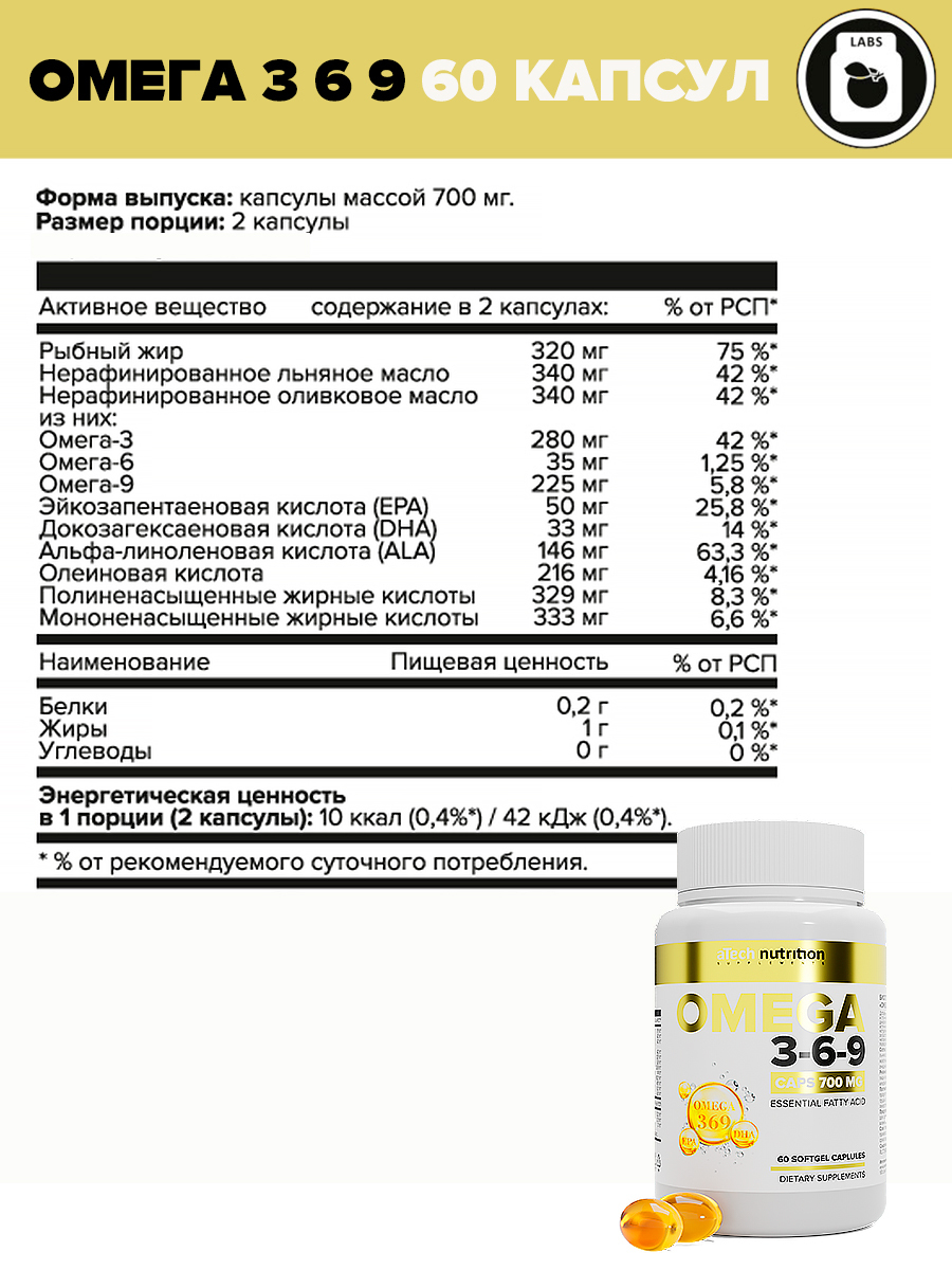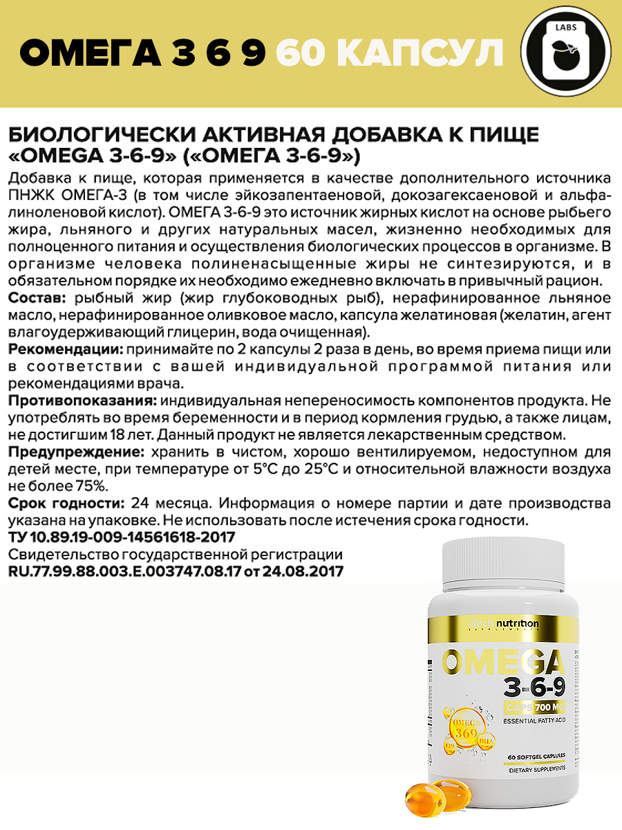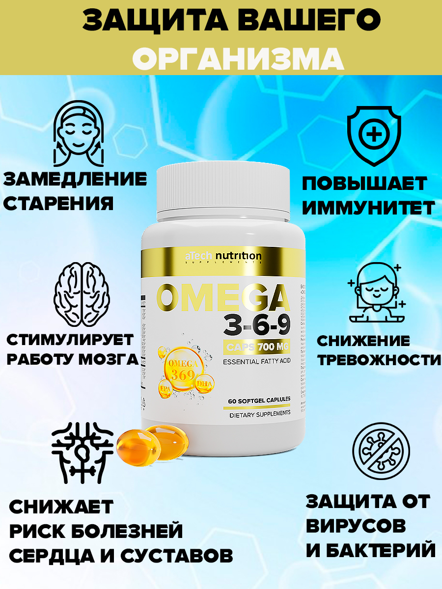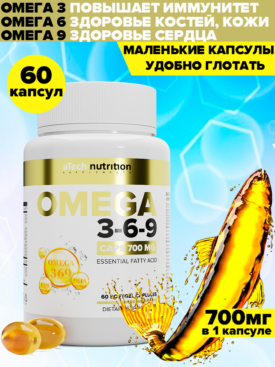 Омега 3 6 9 Рыбий жир Omega 3 6 9 Омега 3-6-9 витамины для взрослых 60 капсул aTech Nutrition