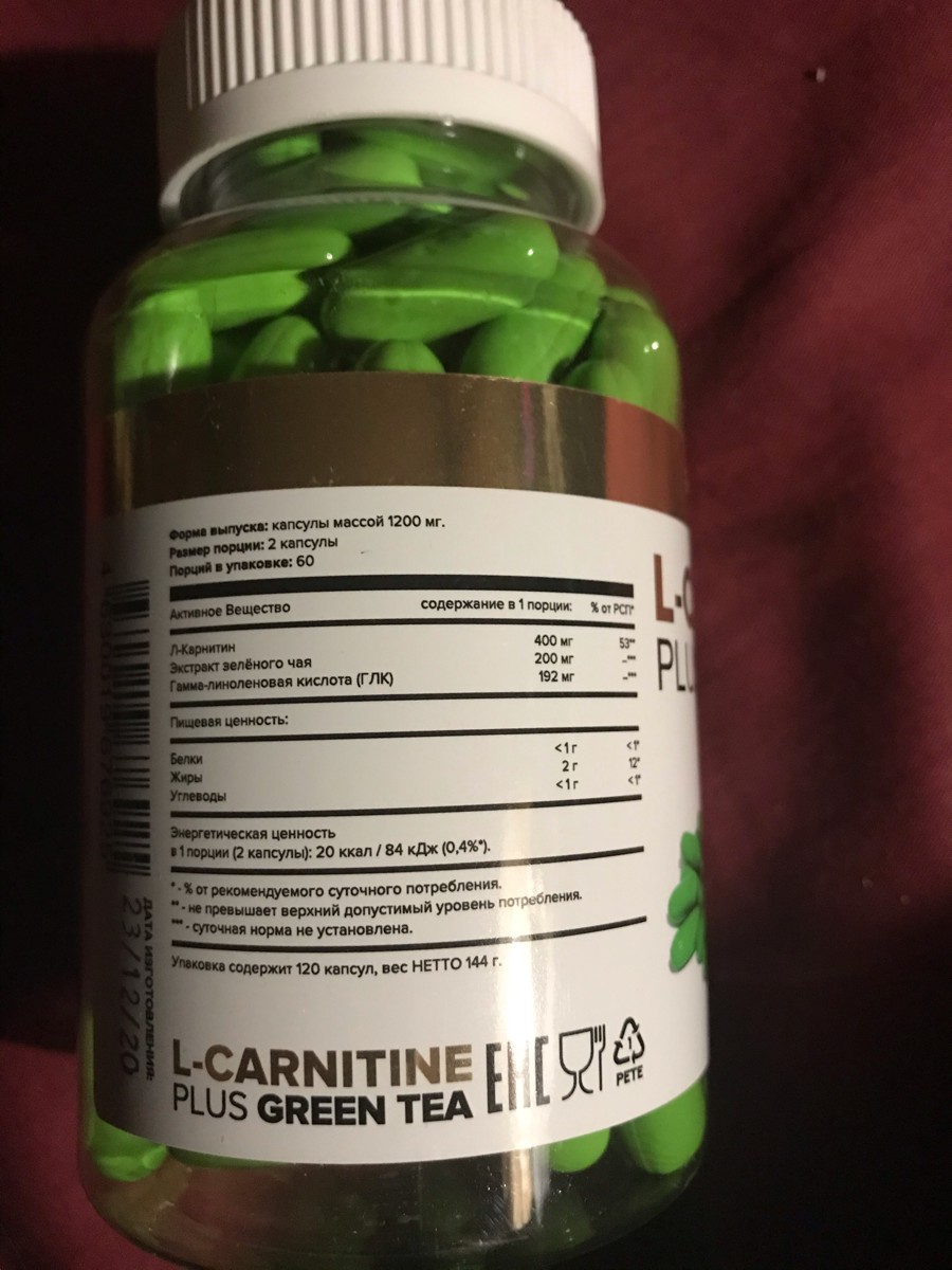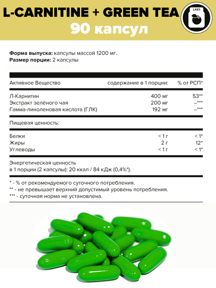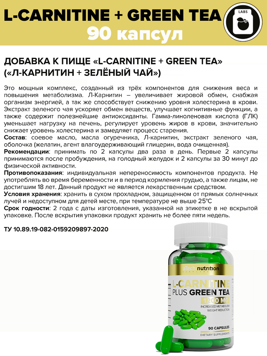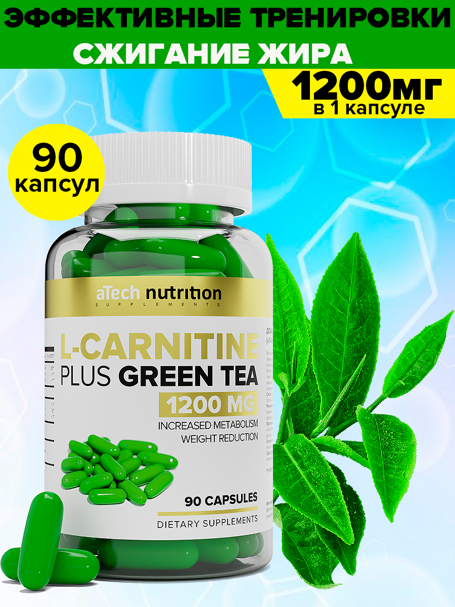 L-CARNITINE + GREEN TEA 1200мг, aTech Nutrition, 90 желатиновых капсул