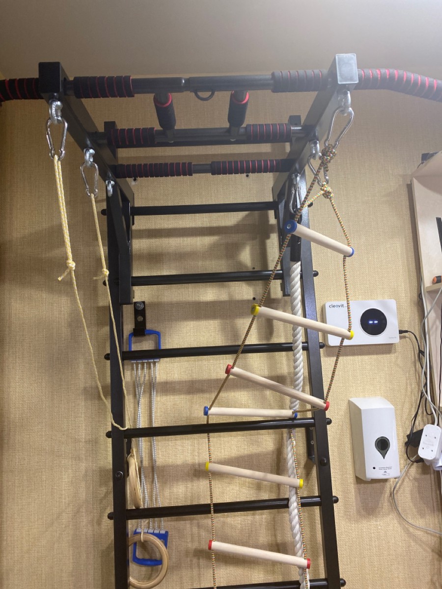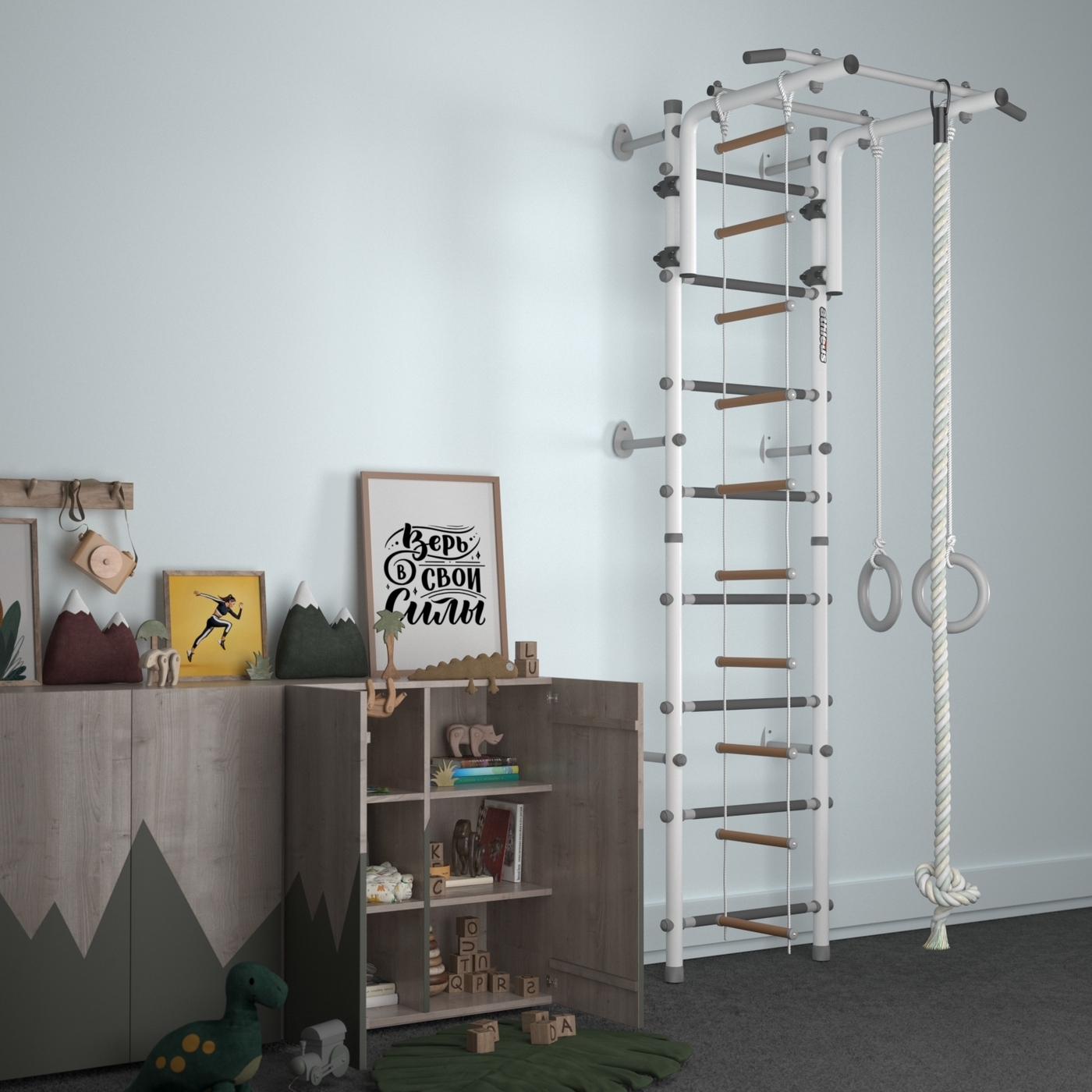 Шведская стенка Athleus Юный Атлет, регулируемый турник, пристенный, пастель (бело-серый)