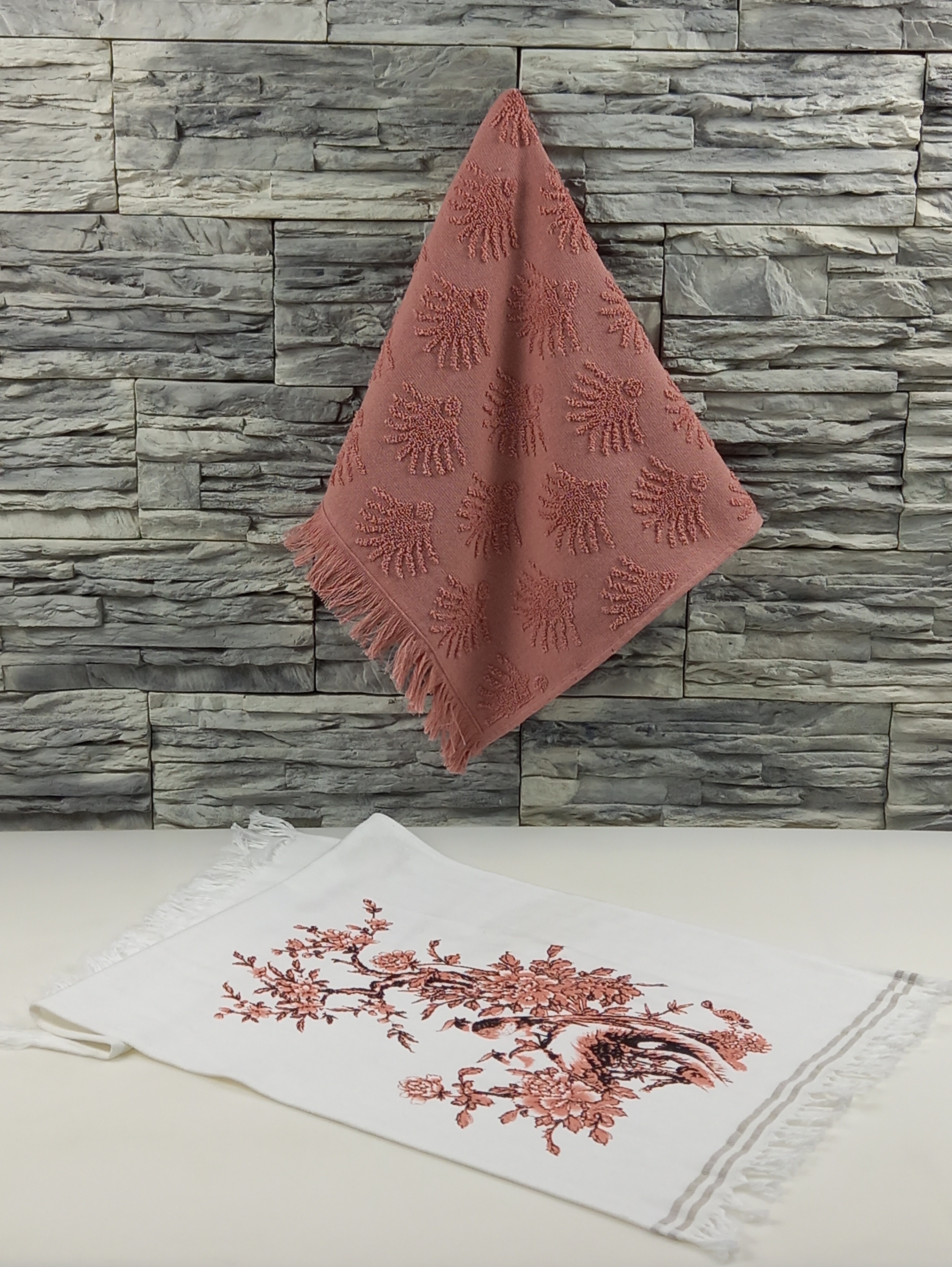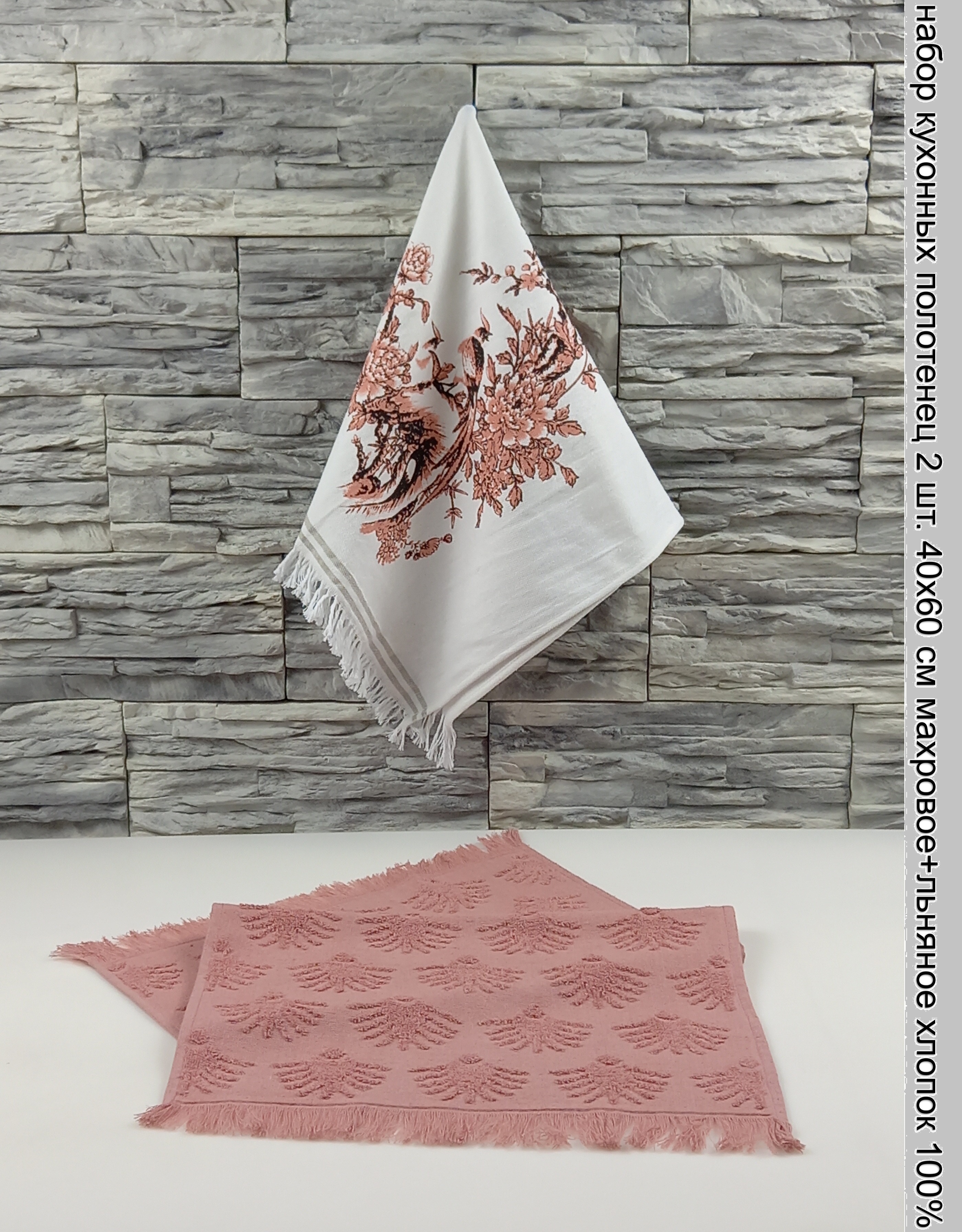 Набор кухонных полотенец 2 шт.(40х60 см) ATLASPLUS Птица, махровое+льняное, коралловый