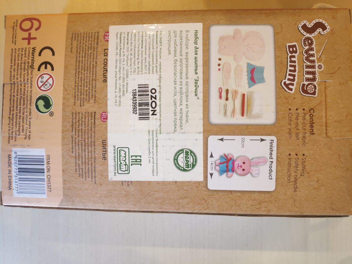 Набор для шитья Avenir Art Мягкая игрушка ЗАЙКА, 22 см