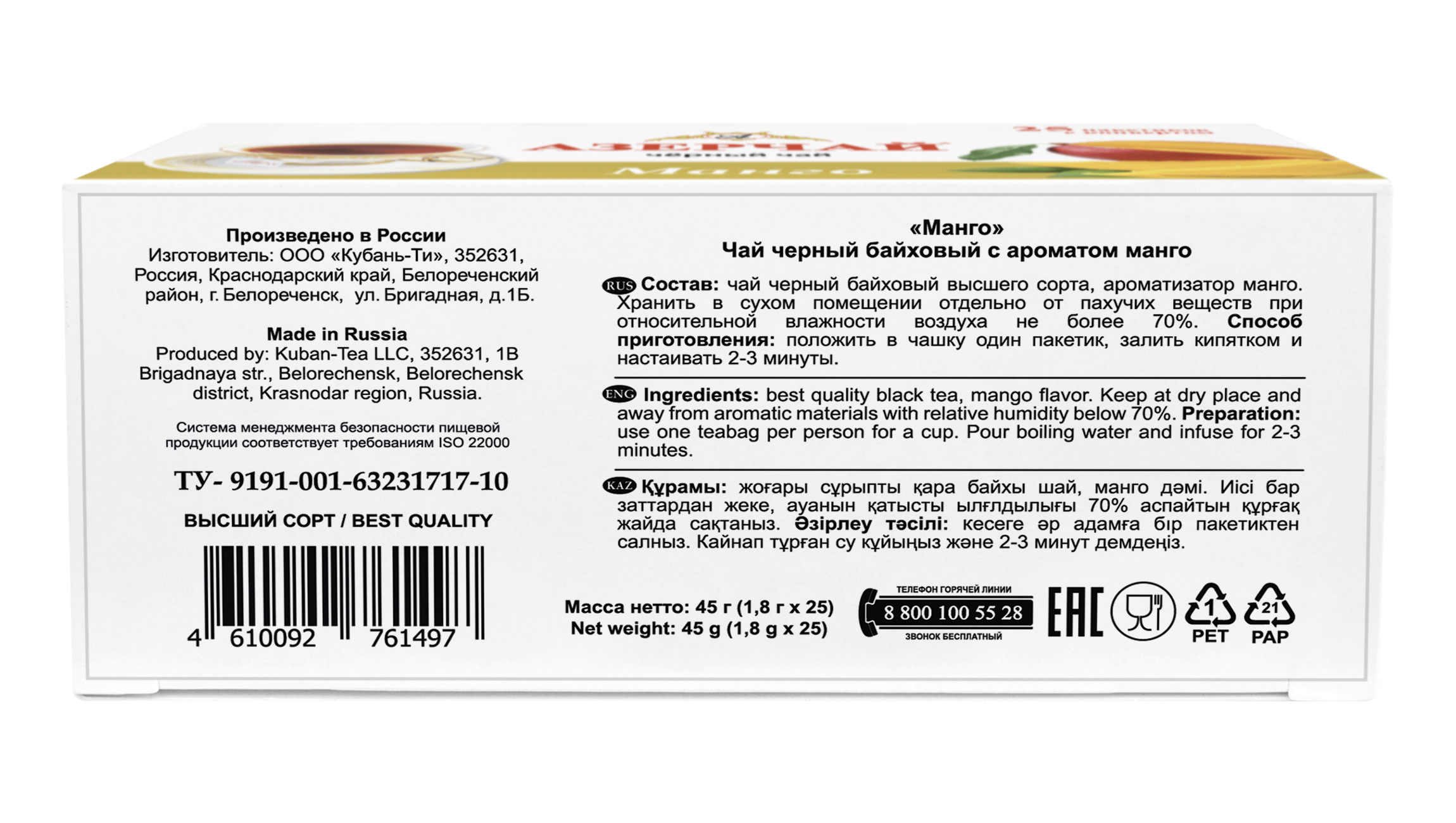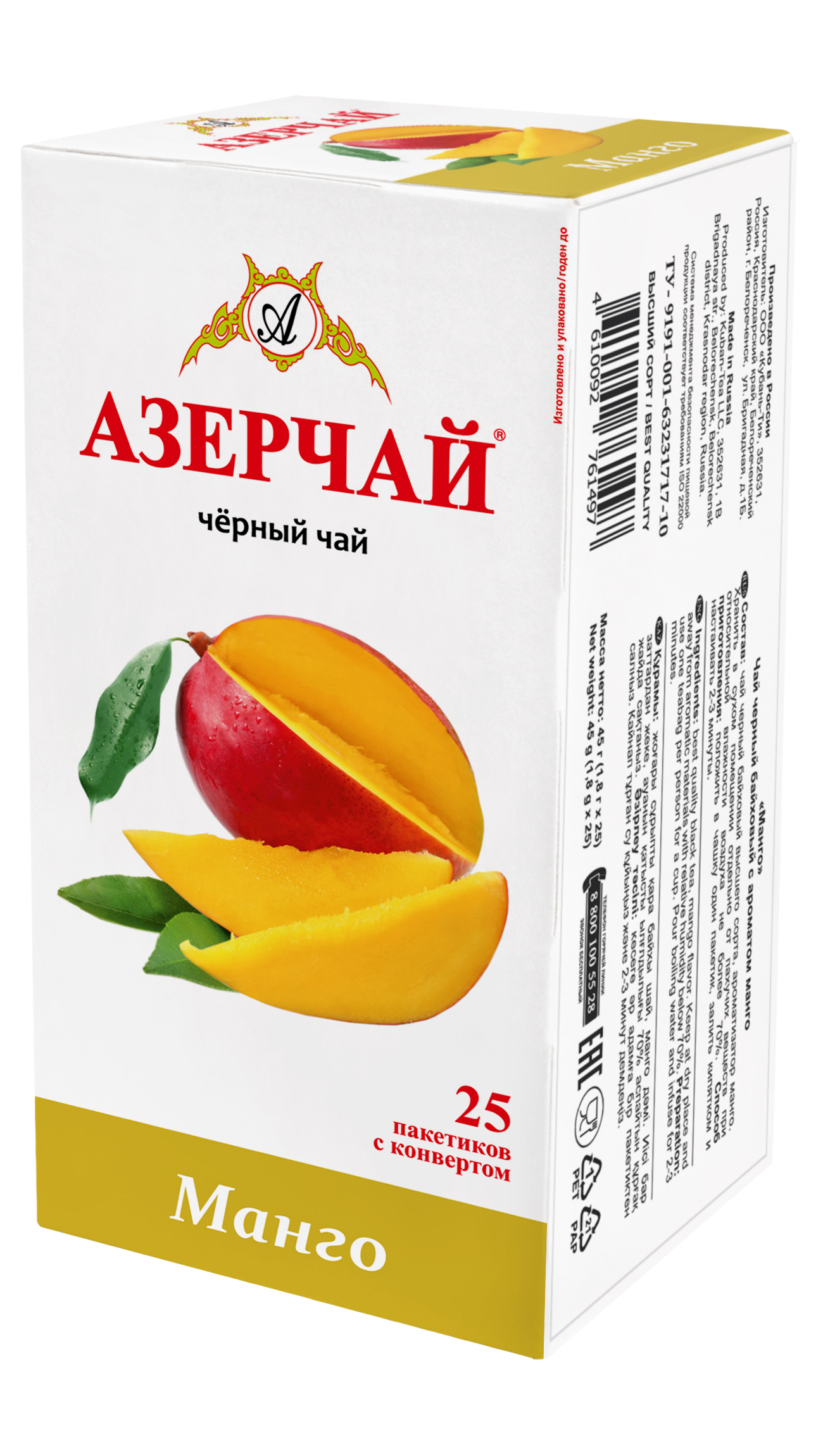 Чай в пакетиках черный Азерчай, с ароматом манго, 25 шт