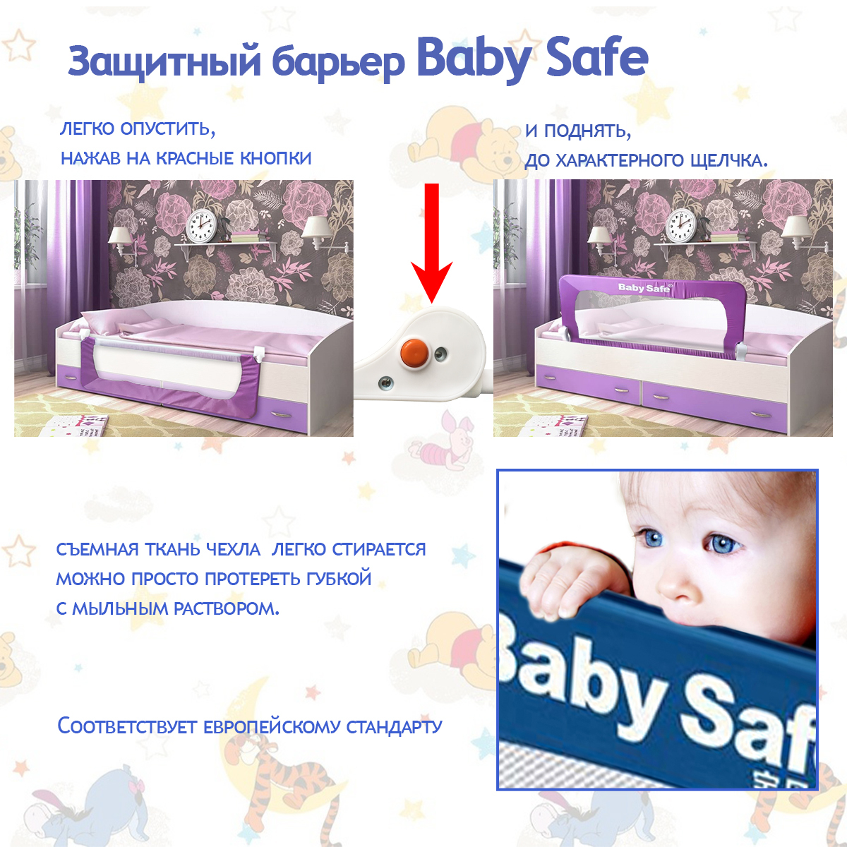 Барьер защитный для кроватки Baby Safe складной "Ушки" 150х42 см розовый
