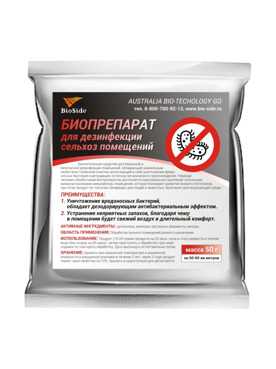 Биопрепарат для дезинфекции сельхоз помещений/BioSide/ 50 гр.