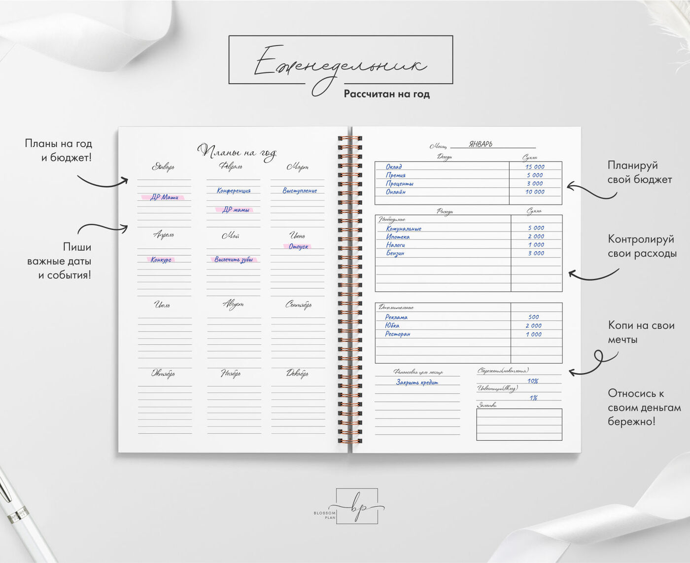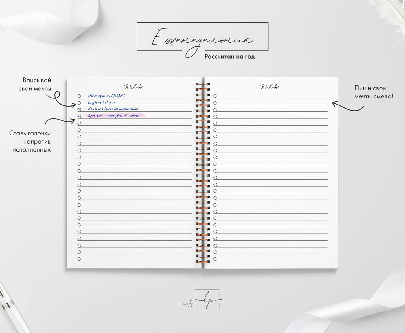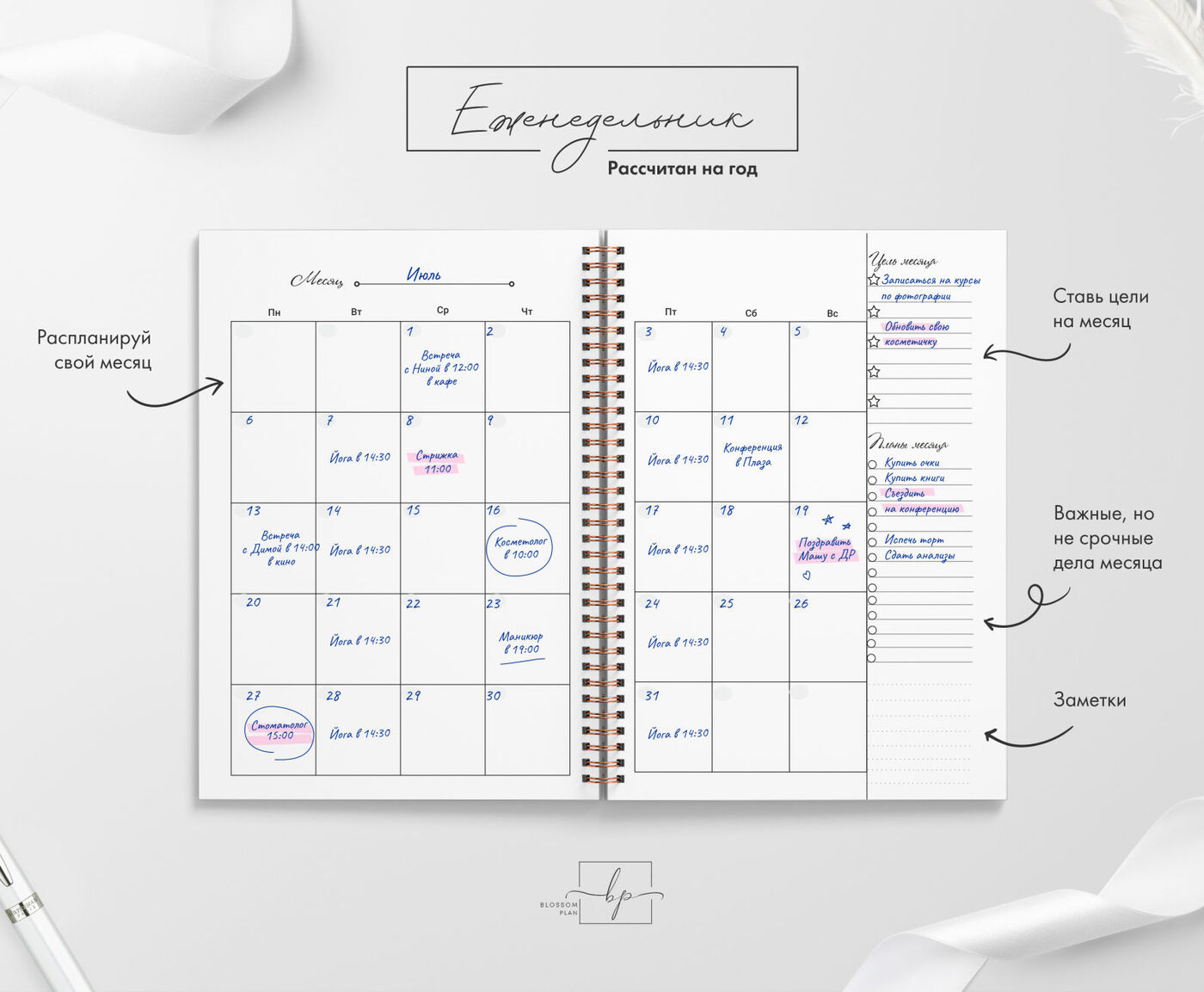 Авторский планер-блокнот еженедельник BlossomPlan "С надписями". Недатированный, А5, 122 страницы