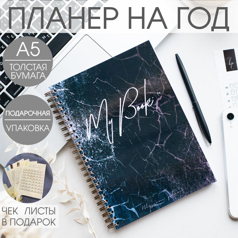 Еженедельник на год планер блокнот BlossomPlan "Черный мрамор". Недатированный, А5, 122 страницы