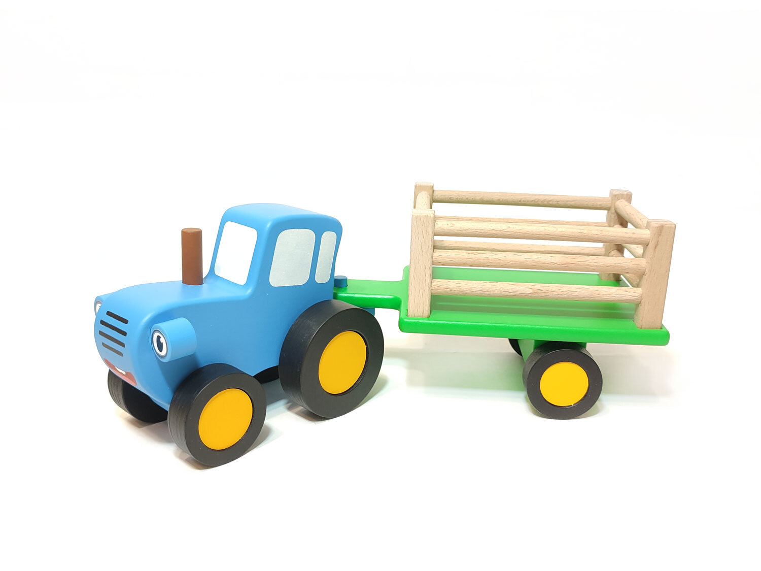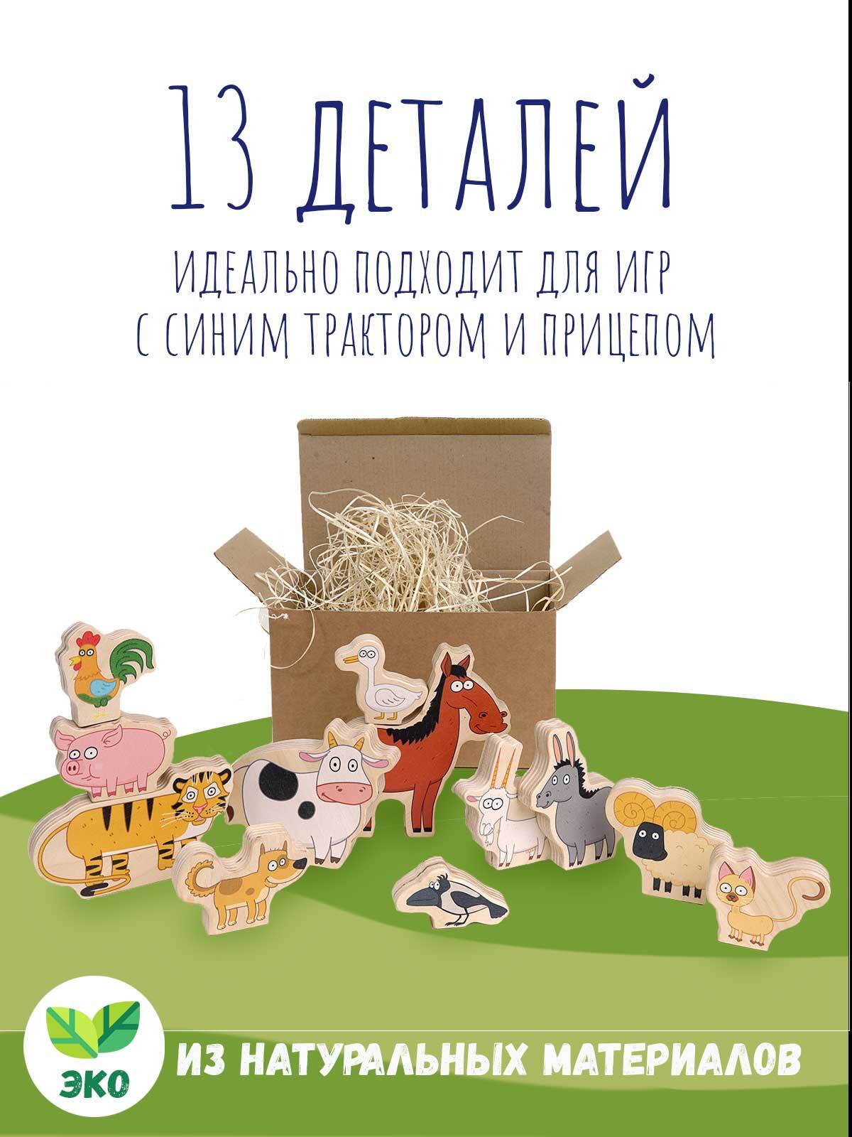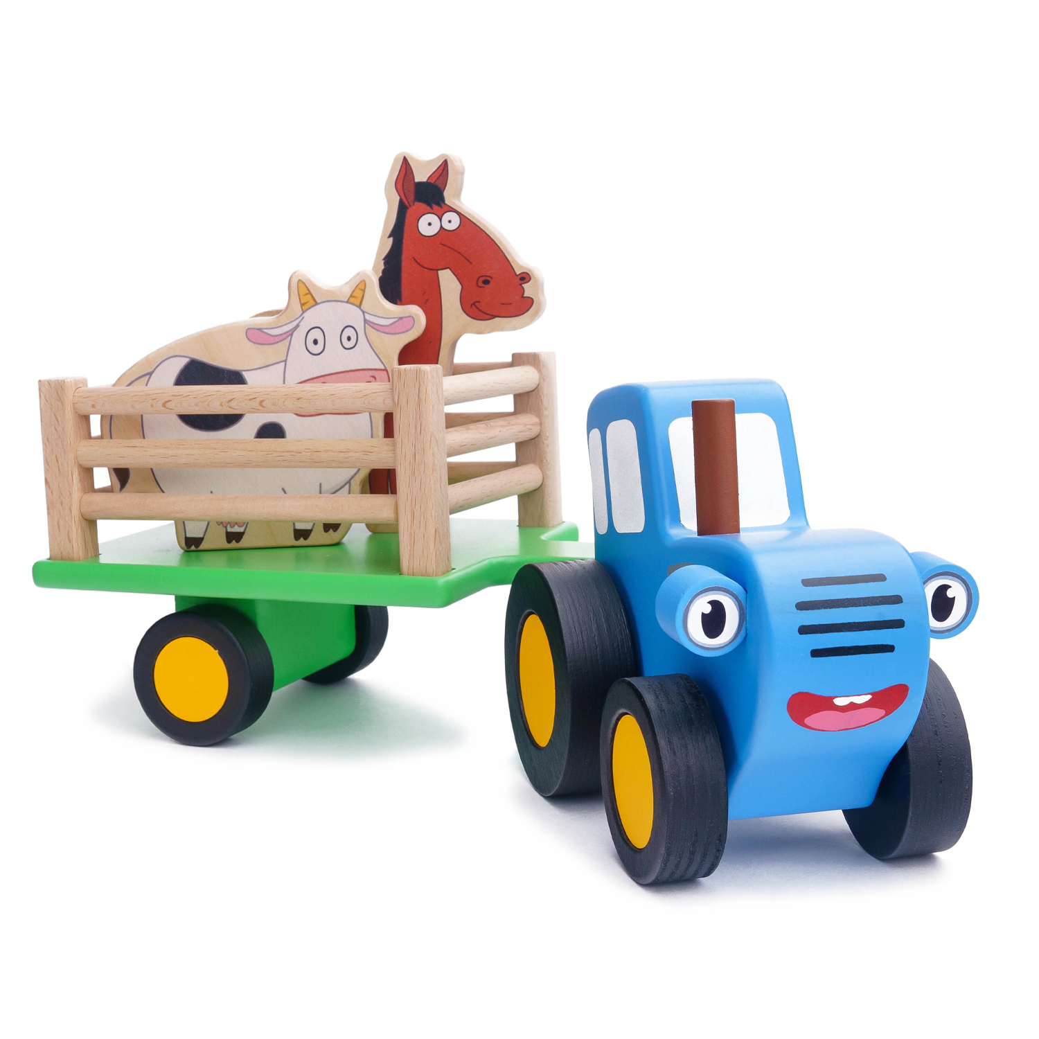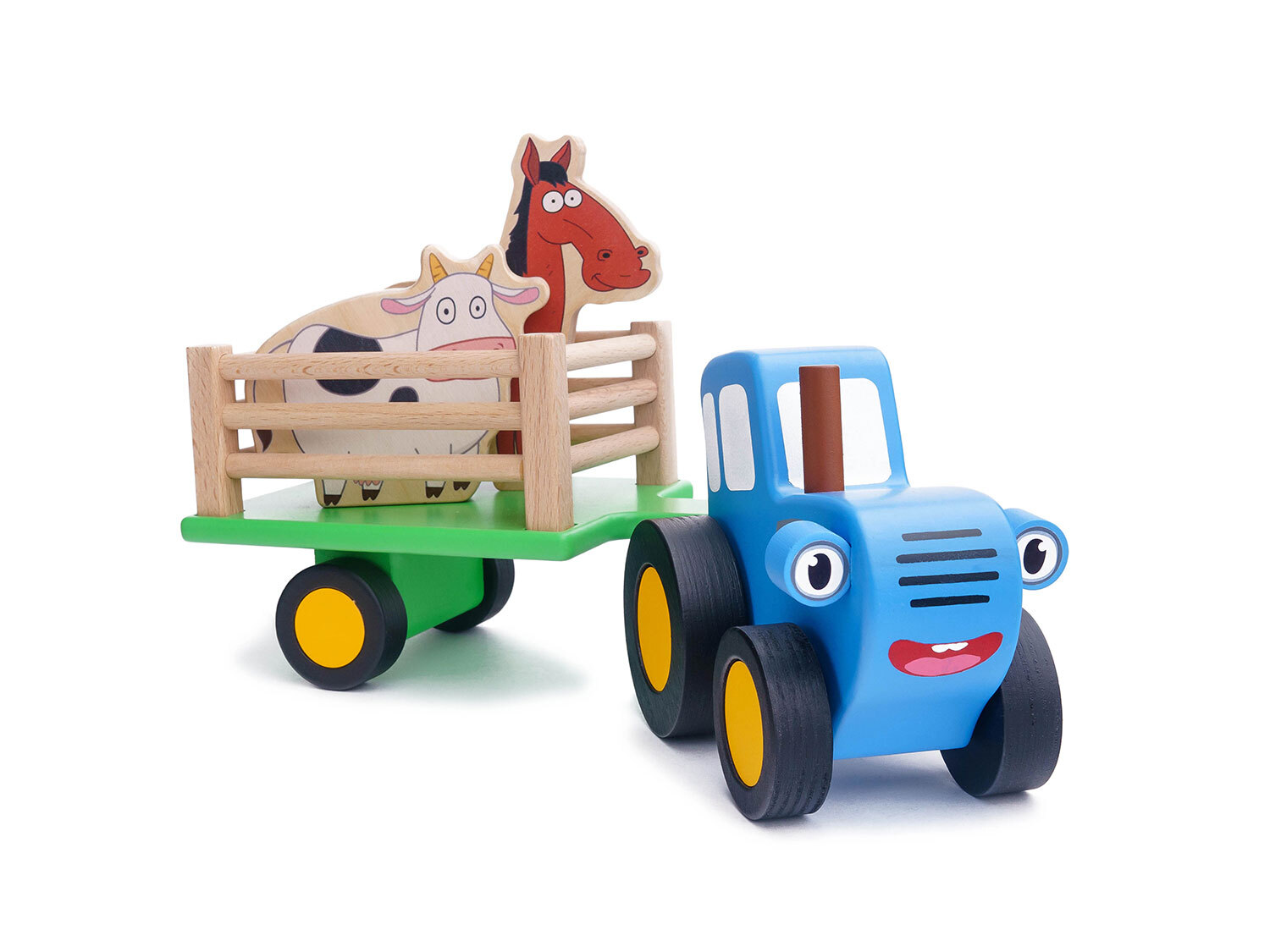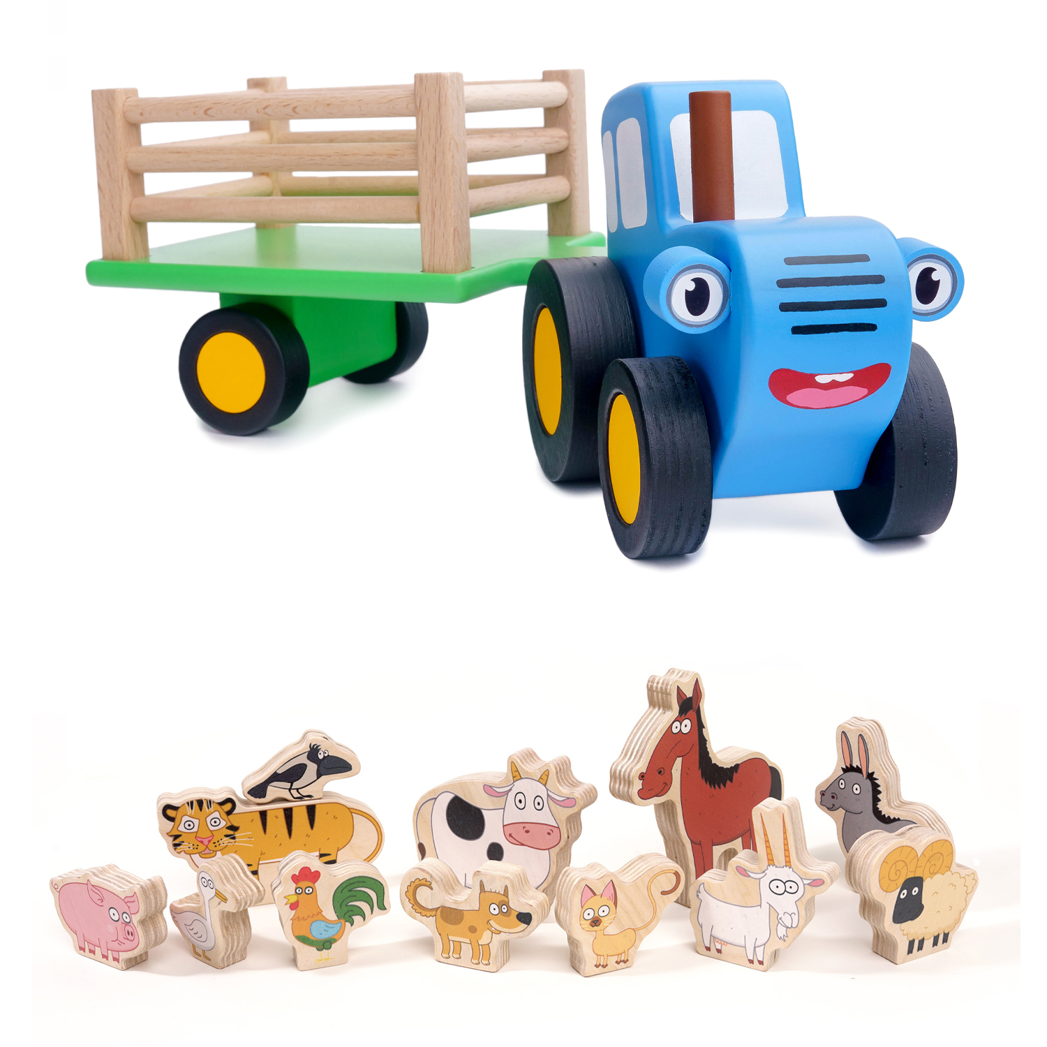 Игровой набор Bochart Синий Трактор Гоша 11 см с прицепом и набор животных (фанера) Едет трактор