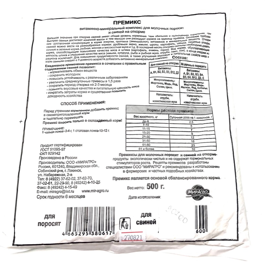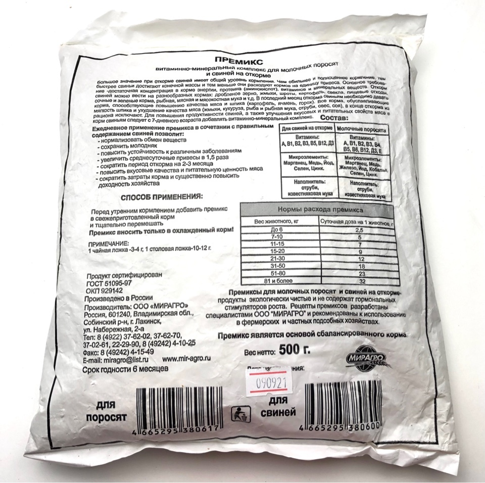 Премикс для молочных поросят 500гр. ГОСТ 51095-97