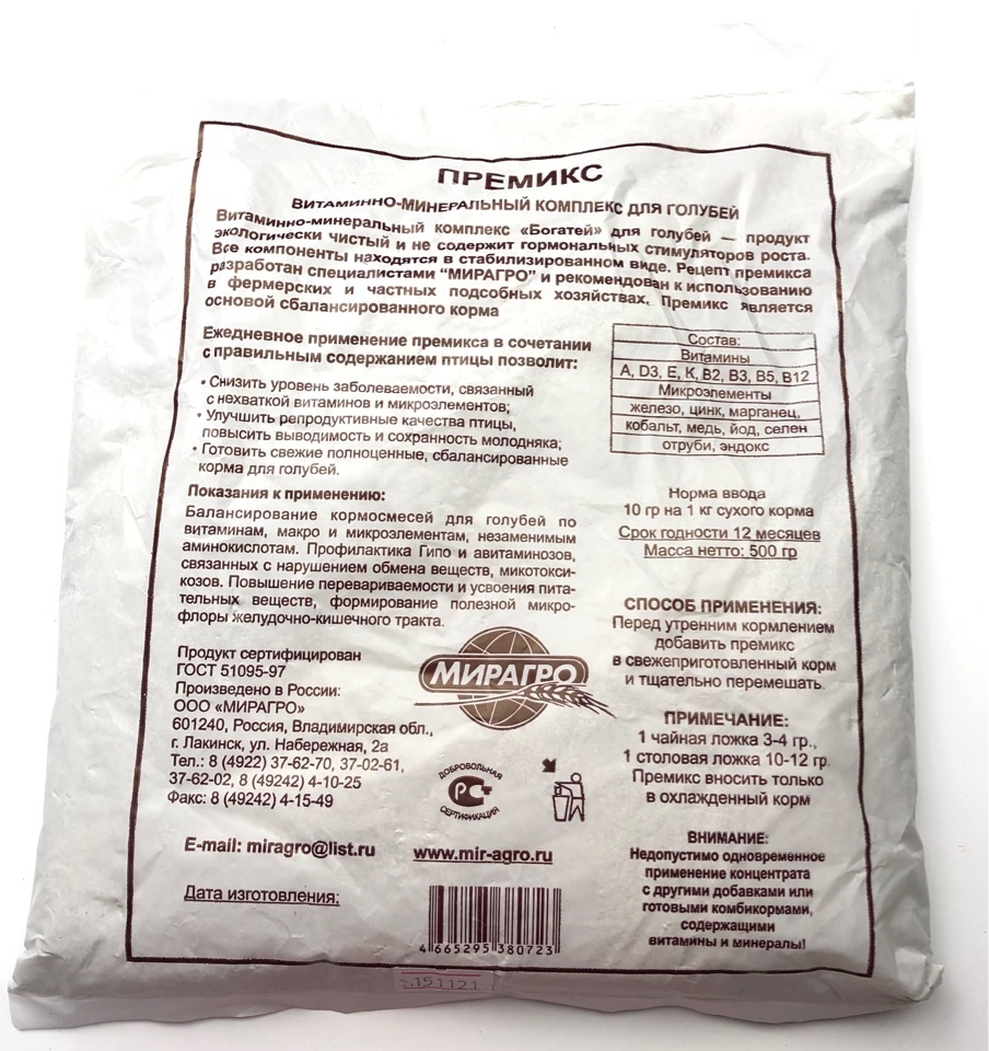 Премикс для голубей Богатей 500 гр. ГОСТ Р 51095-97