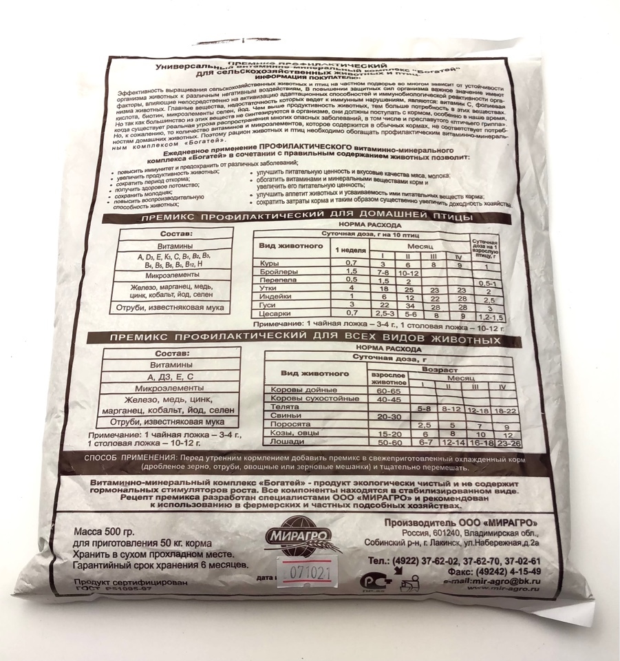Премикс профилактический для всех видов с/х животных Богатей 500гр. ГОСТ Р51095-97