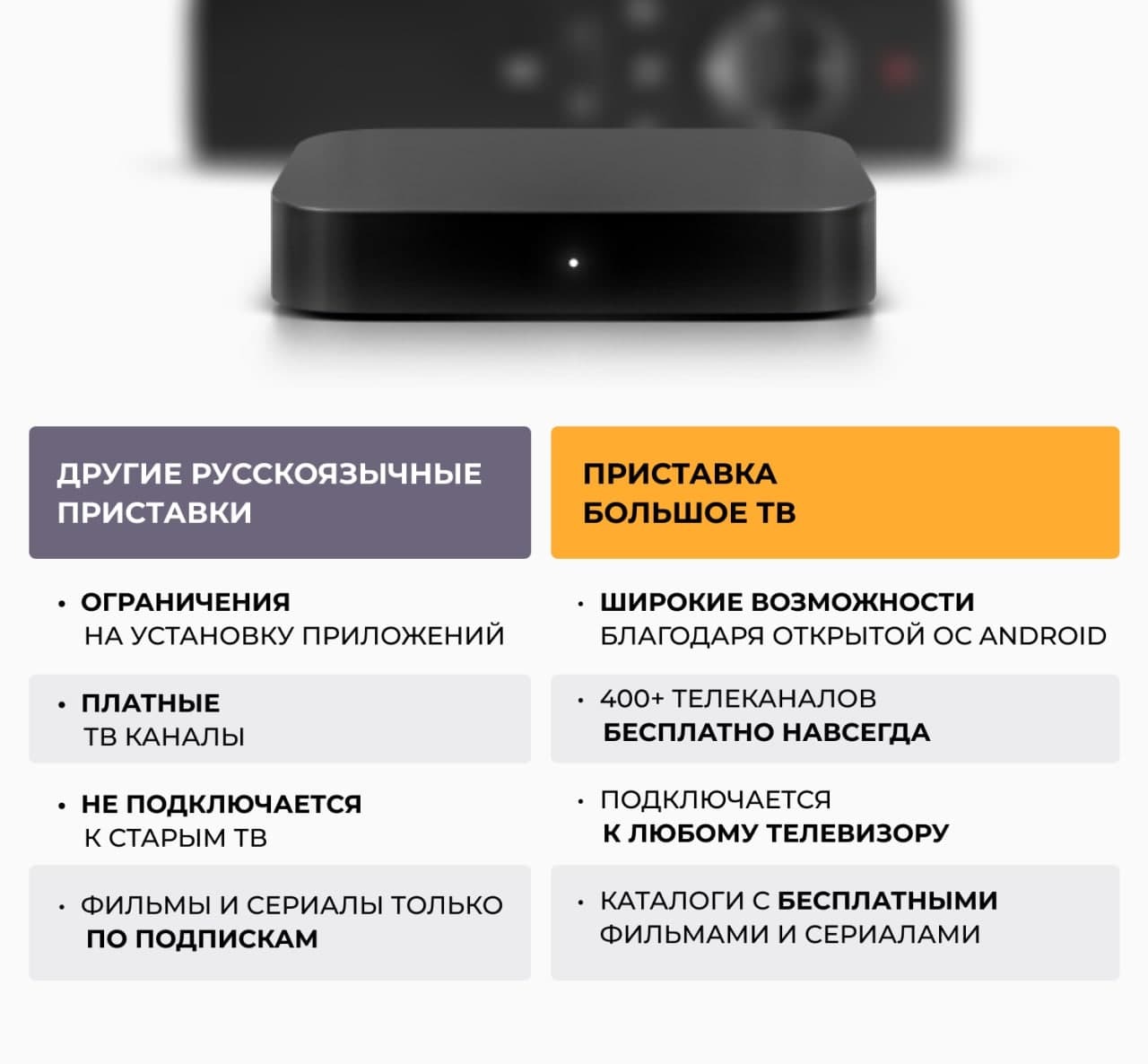 Смарт ТВ андроид Wi-Fi приставка Большое ТВ PRO с голосовым управлением + 400 ТВ-каналов без абонентской платы