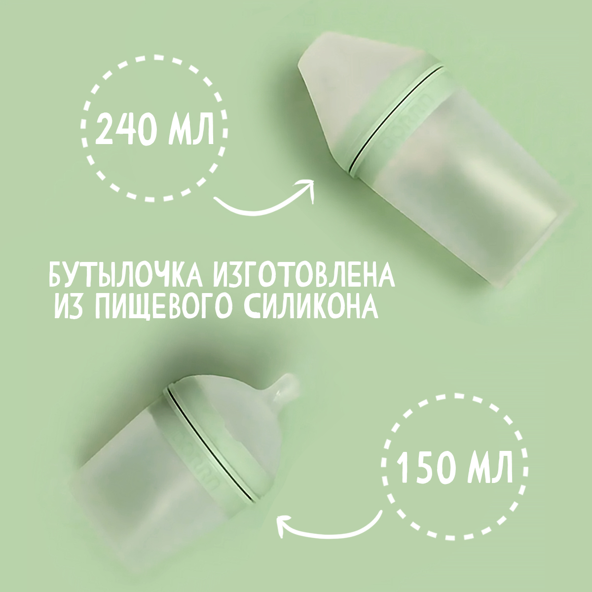 Бутылочка для кормления из силикона BORRN Baby Feeding Bottle, 150 мл, с медленным потоком (зеленая)