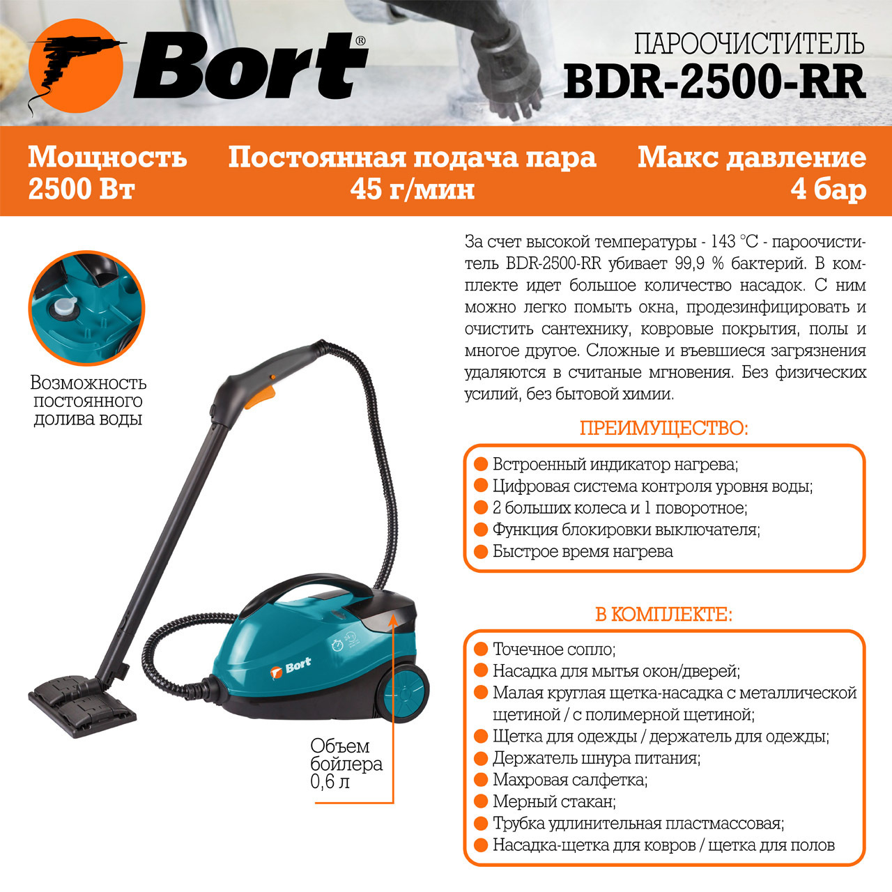 Пароочиститель Bort BDR-2500-RR, бирюзовый