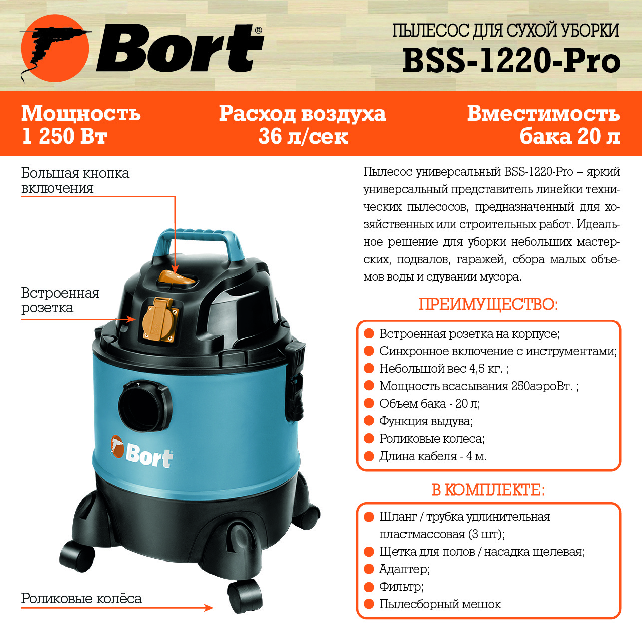 Промышленный пылесос Bort BSS-1220-Pro 6 л, 1250 Вт