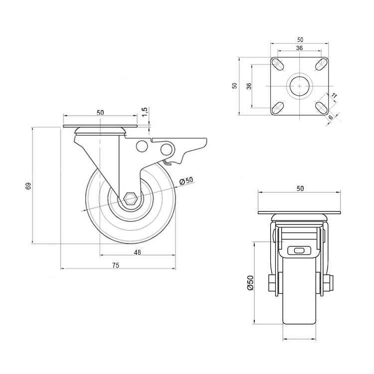 Комплект 2 колес поворотных 50 мм. с тормозом серая резина(33050B1)