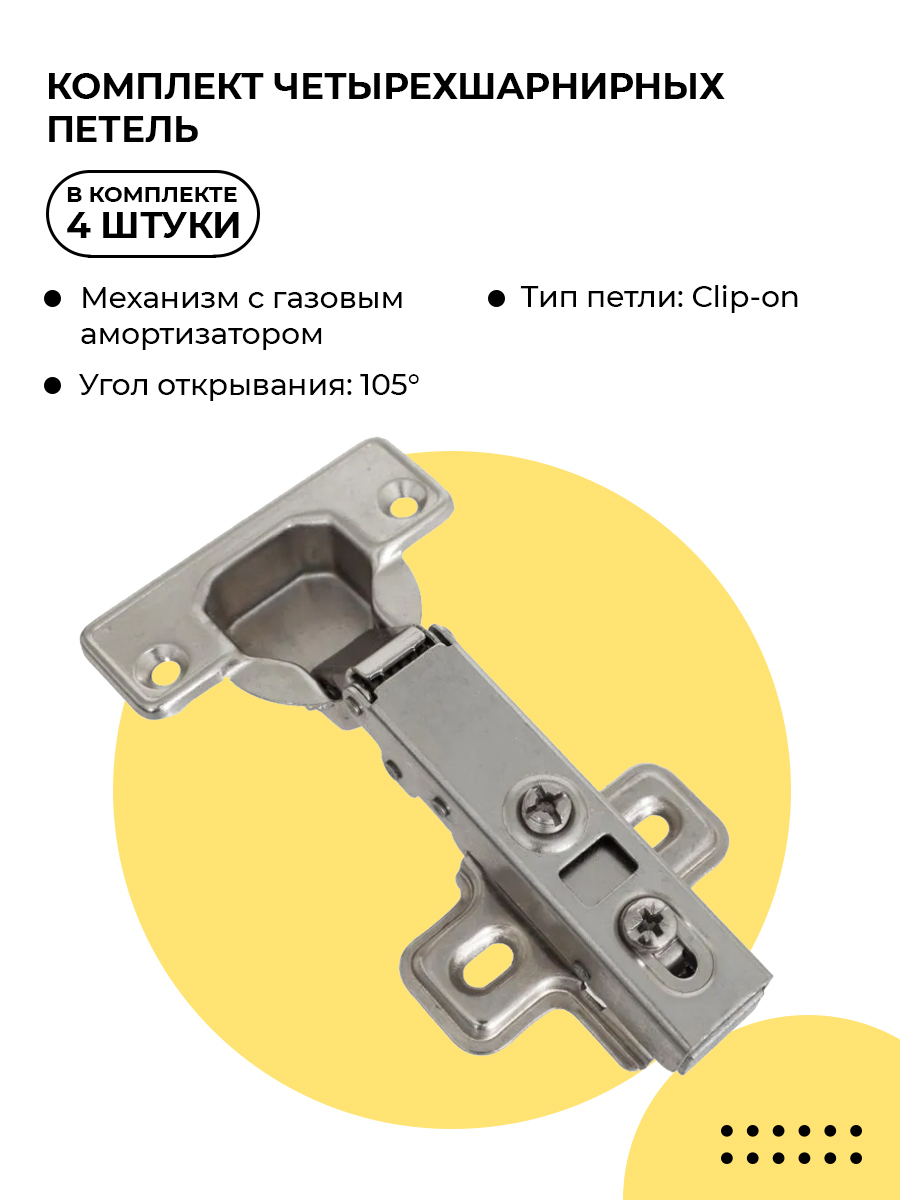 Комплект 4 петель четырехшарнирных CLIP-ON с газ.пружиной,105 гр. накладная тип А