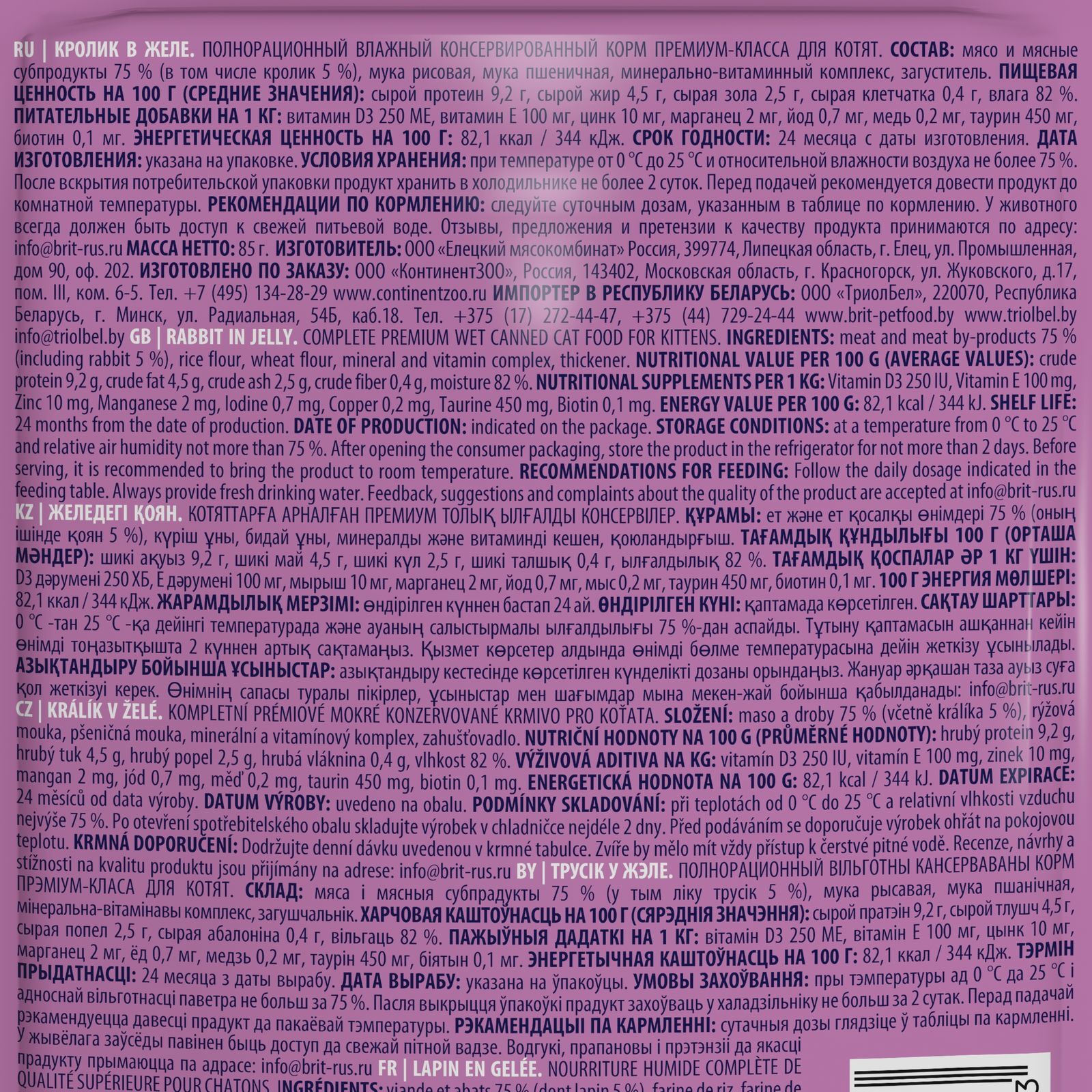 Корм влажный для котят Brit Premium, кролик в желе, 85 г х 14 шт