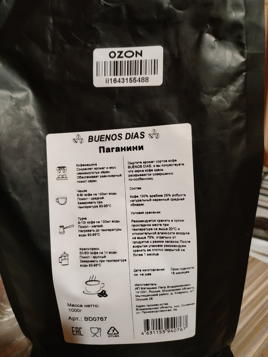 BUENOS DIAS / Кофе Паганини (75% арабика и 25% робуста) в зёрнах, уп. 1 кг
