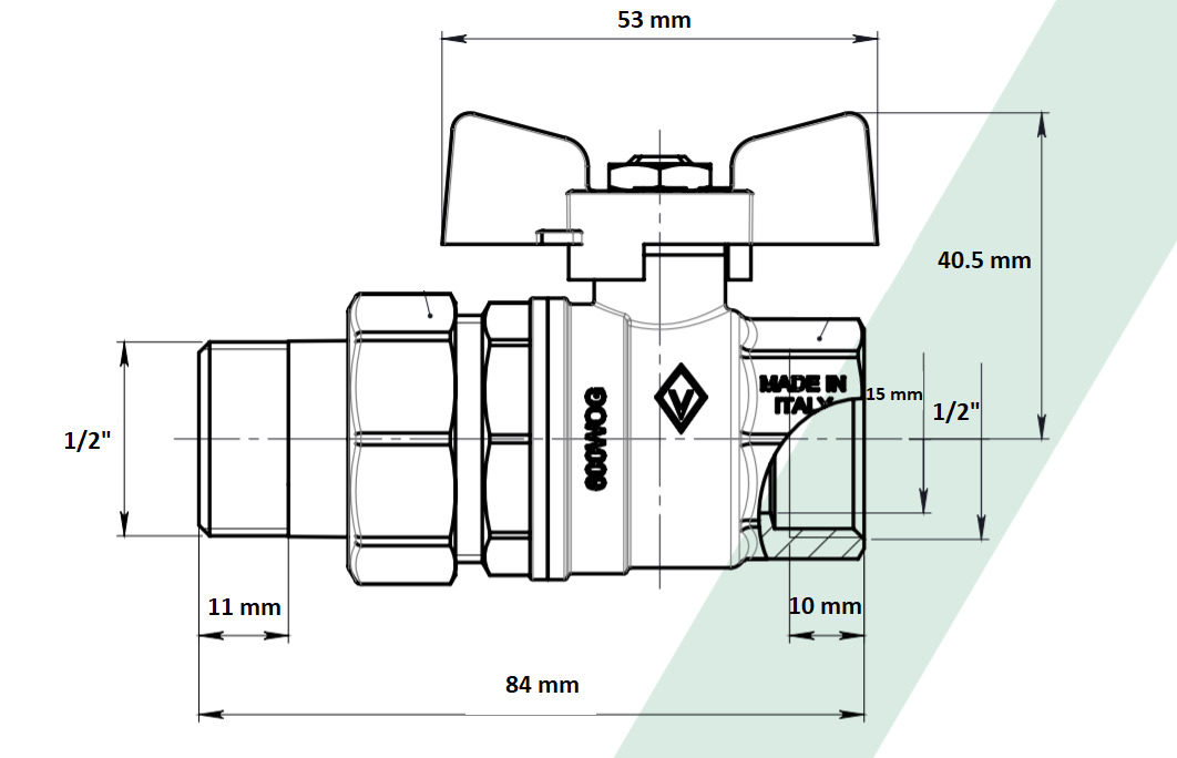Кран шаровый с американкой Bugatti Oregon 1/2", внутренняя-наружная резьба, бабочка 03220027