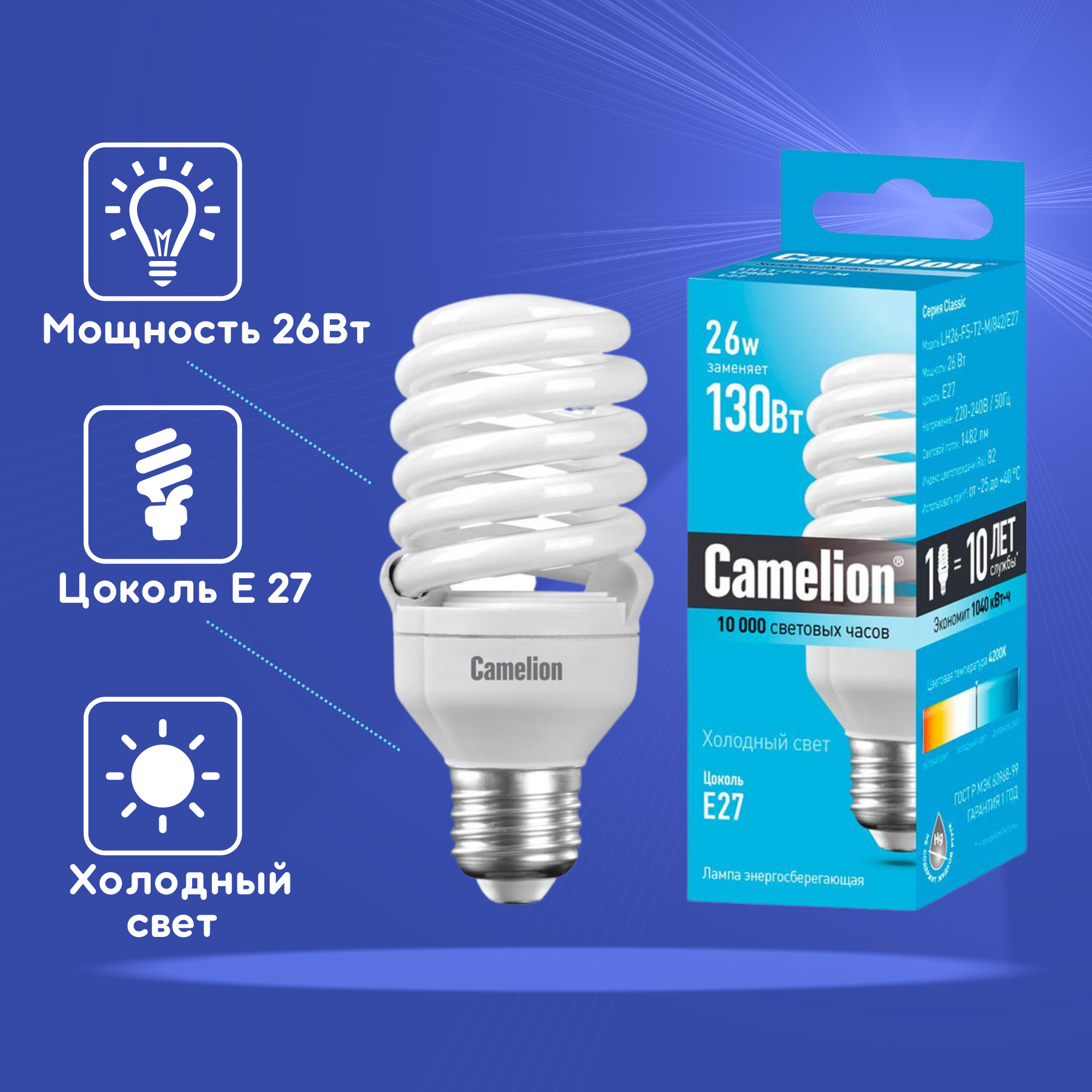 Лампа люминесцентная энергосберегающая 26Вт, 4200К, Е27, CAMELION