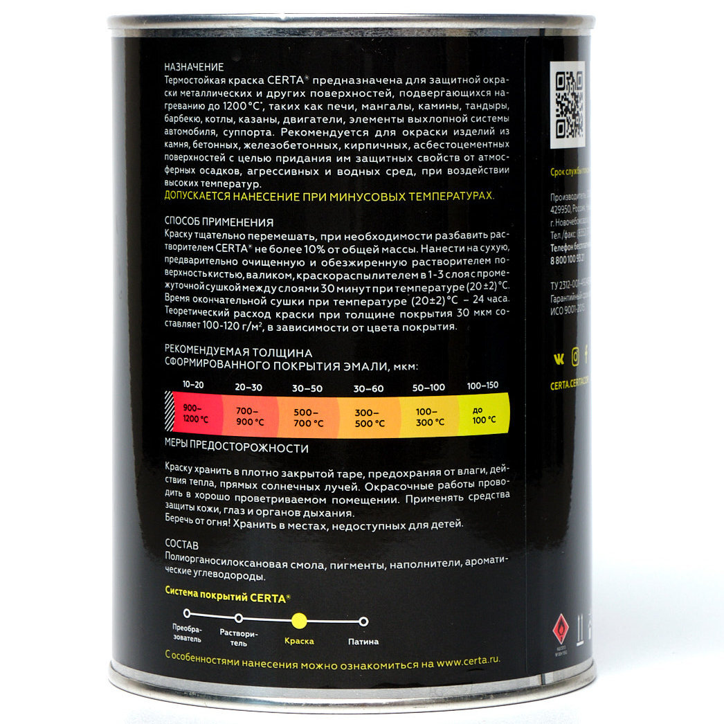 Краска CERTA до +1200°C Термостойкая, Быстросохнущая, до800°, Матовое покрытие, 0.8 кг, черный