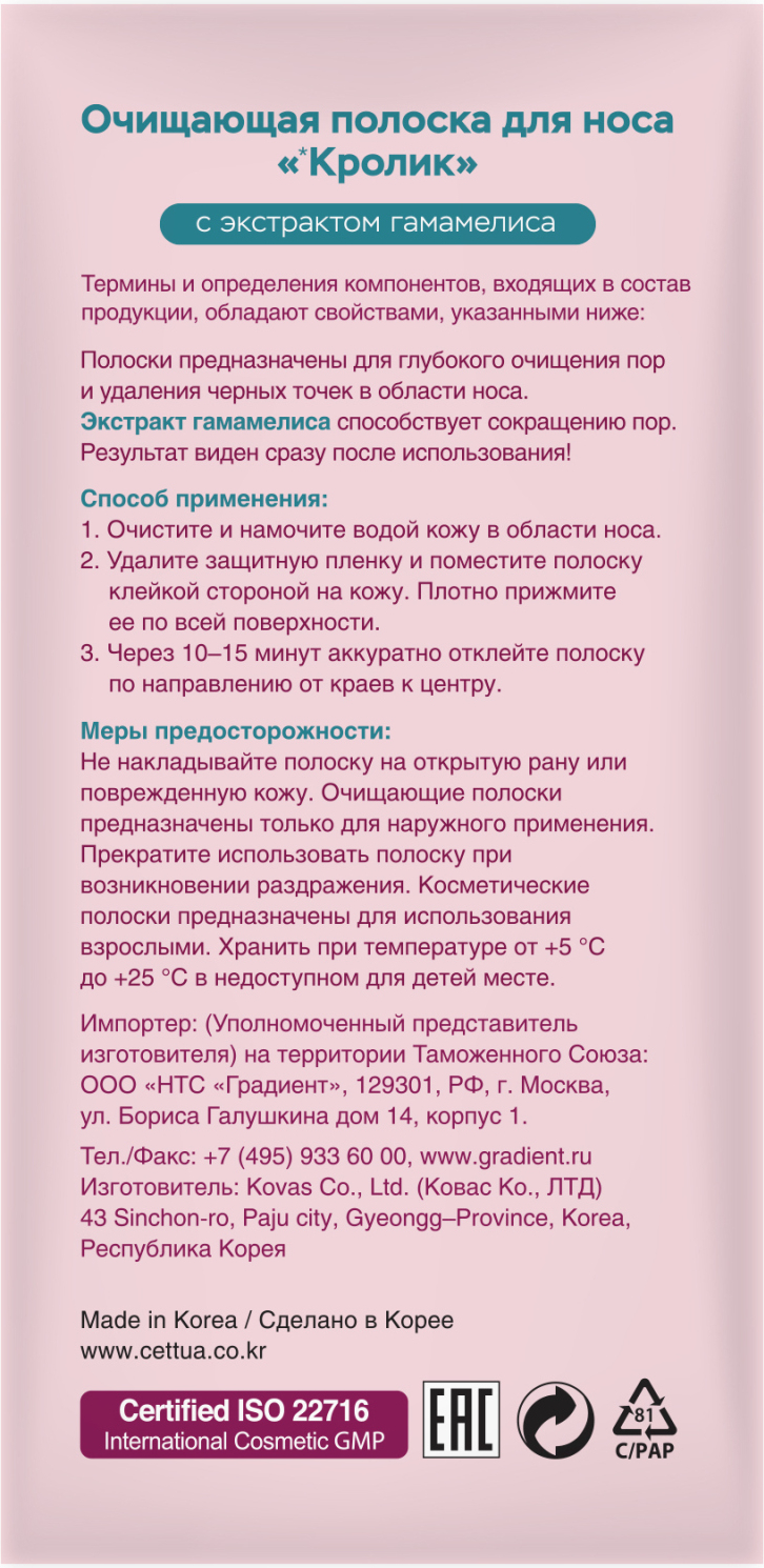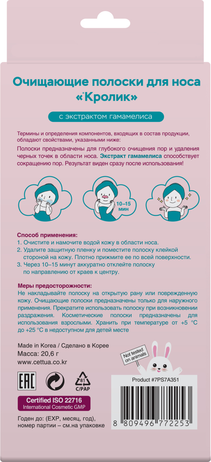 CETTUA Полоски для носа Кролик очищающие, 25 г