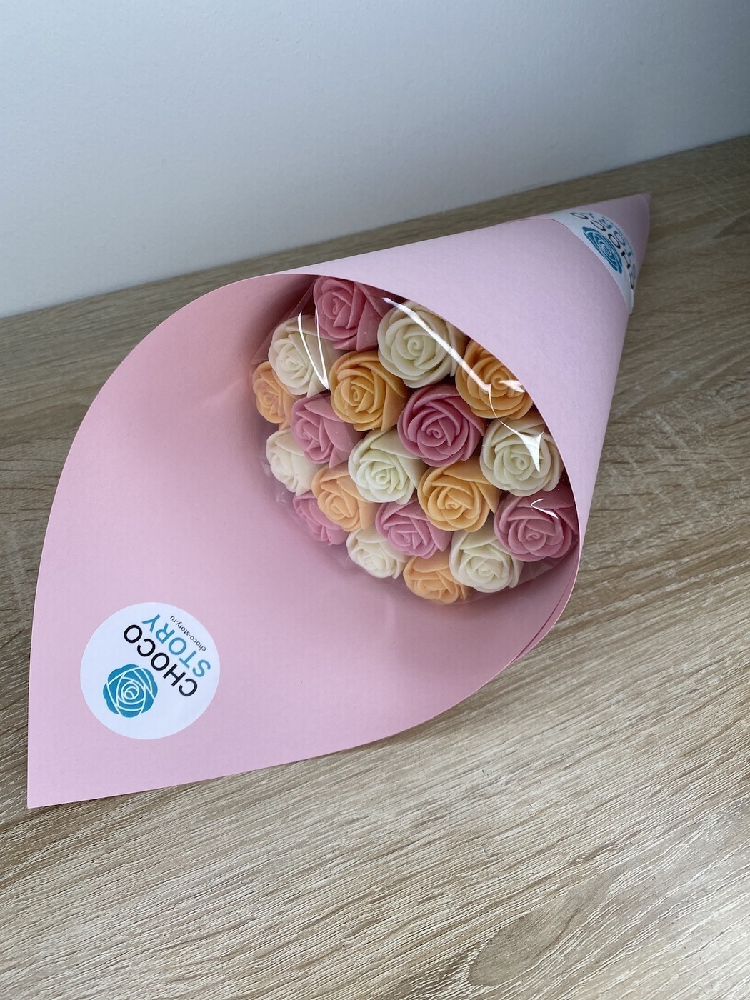 Шоколадный букет из 19 розочек CHOCO STORY в нежно розовой подарочной бумаге - Белый бельгийский шоколад, 228 гр., B19-R-B-211120