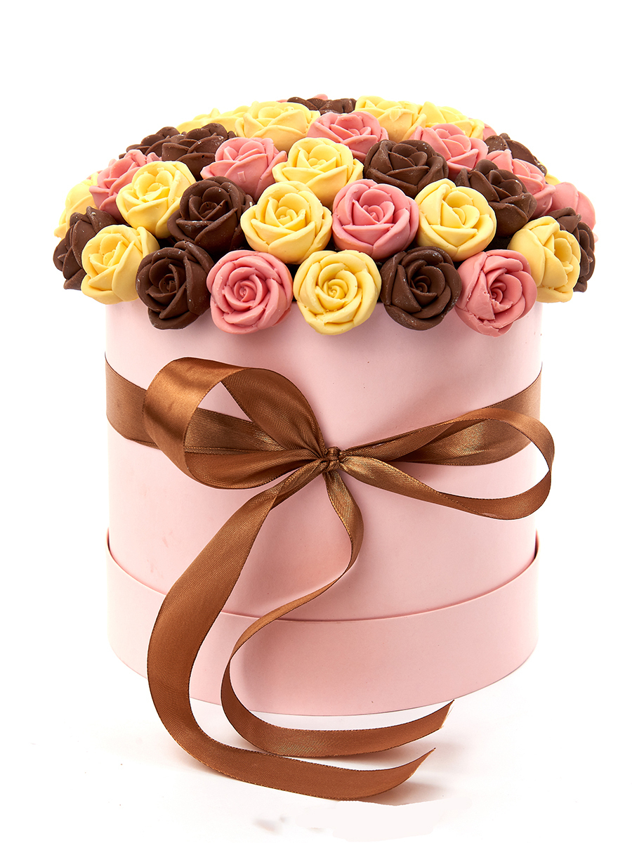 Корзинка из 27 шоколадных роз CHOCO STORY - Белый, Розовый и Голубой микс из бельгийского шоколада, 324 гр. OZ02-K27-BRG-211120
