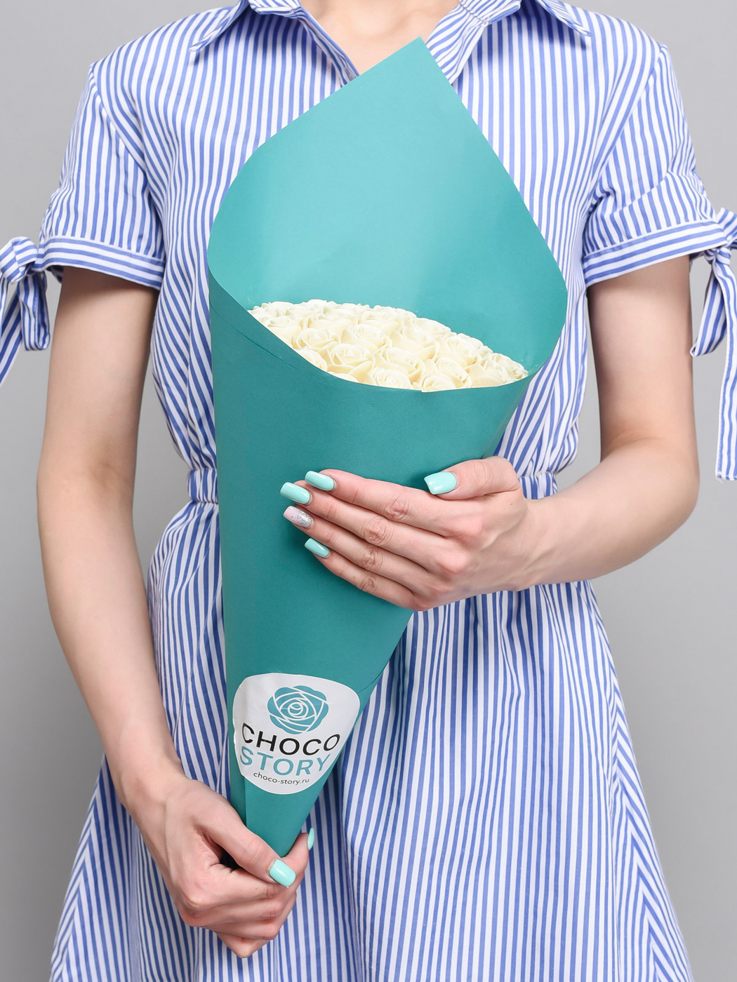 Белые Съедобные Розы из шоколада - 19 шт., в форме подарочного Голубого букета CHOCO STORY, 228 гр., B19-G-B B19-G-B-211120
