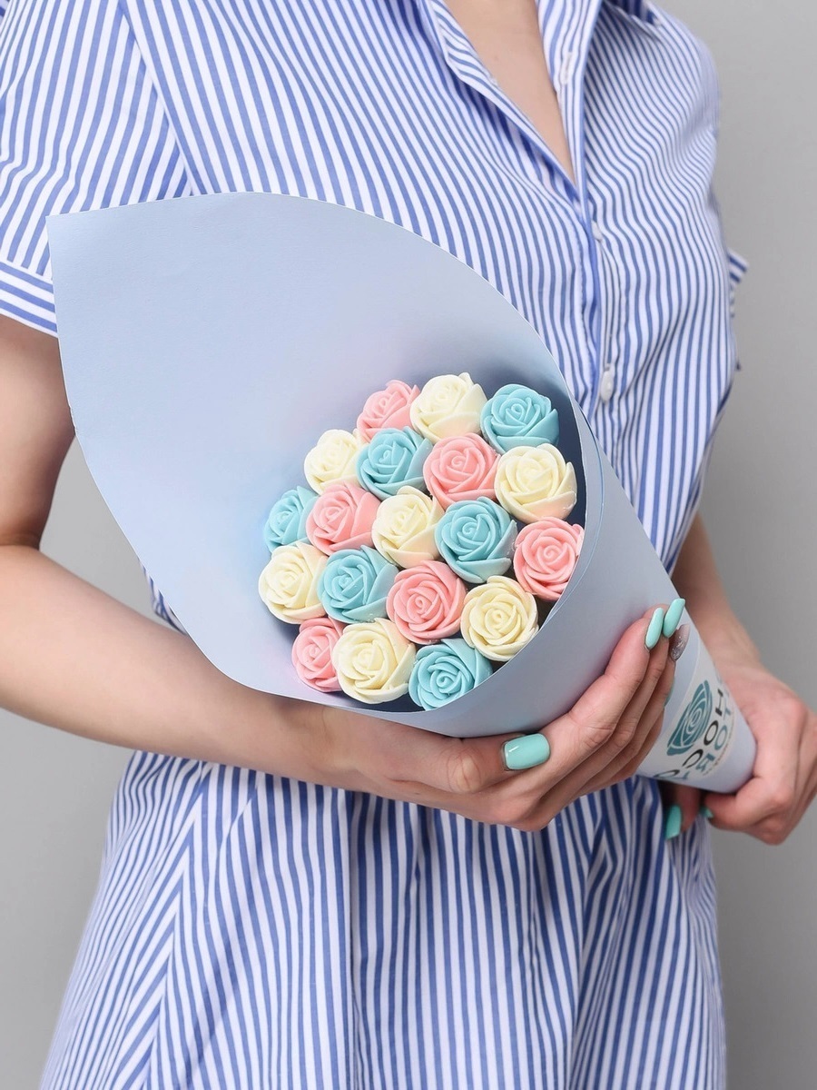 Букет из 19 Шоколадных розочек в цвете Аквамирин CHOCO STORY - Белый, Голубой и Розовый бельгийский шоколад, 228 гр., B19-A-BGR-211120