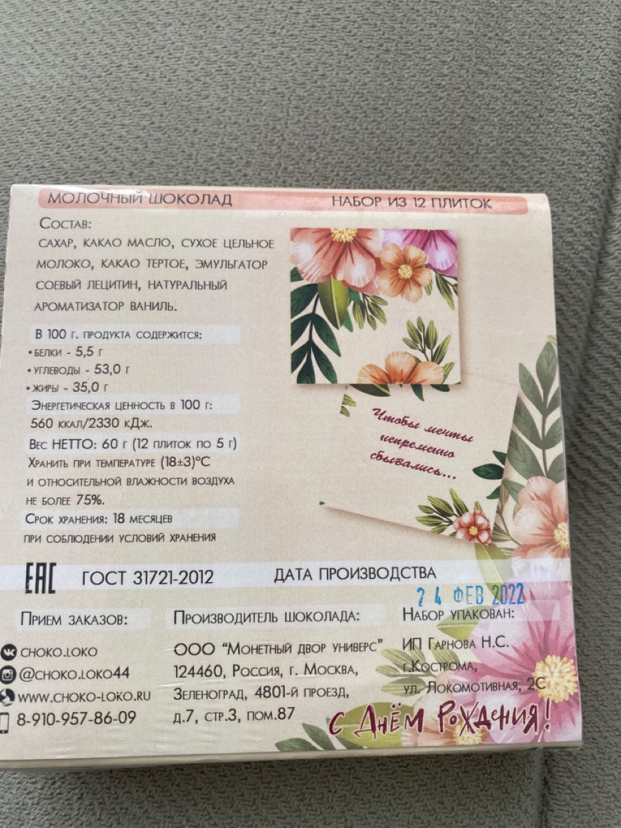 Шоколадный набор "С Днём Рождения" цветочки, 12 шоколадок по 5 гр с пожеланиями