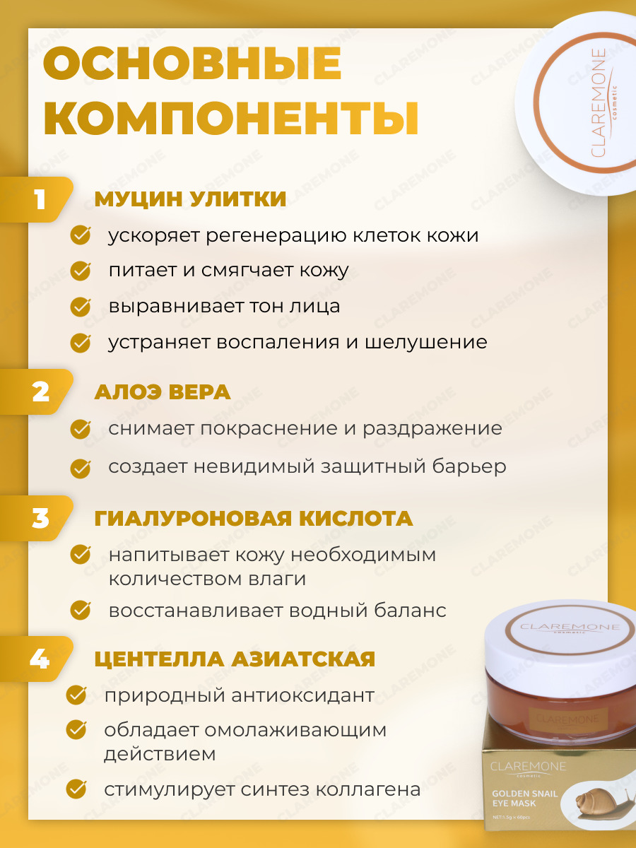 CLAREMONE Гидрогелевые патчи для глаз от морщин и против отечности с муцином улитки и экстрактом алоэ, 60 шт.