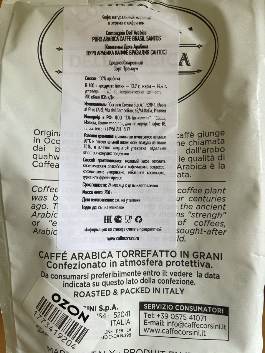 Кофе в зернах Compagnia Dell'Arabica Brasil Santos 250 г