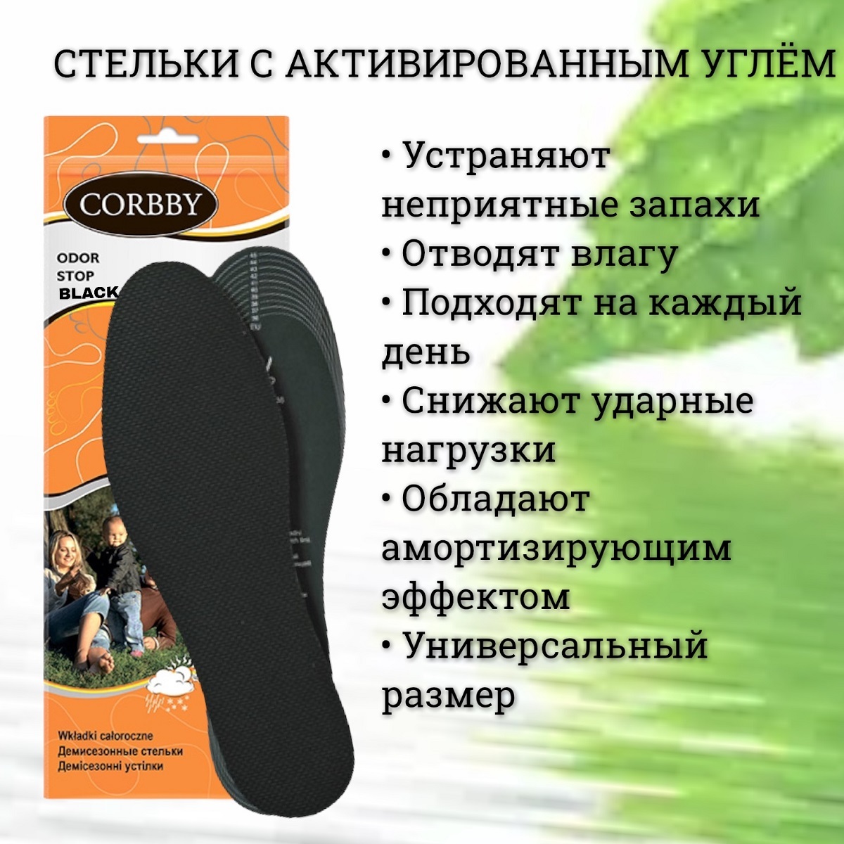 Стельки антизапах, антипот, антивлага ODOR STOP BLACK. Черные. Размер 36-46.