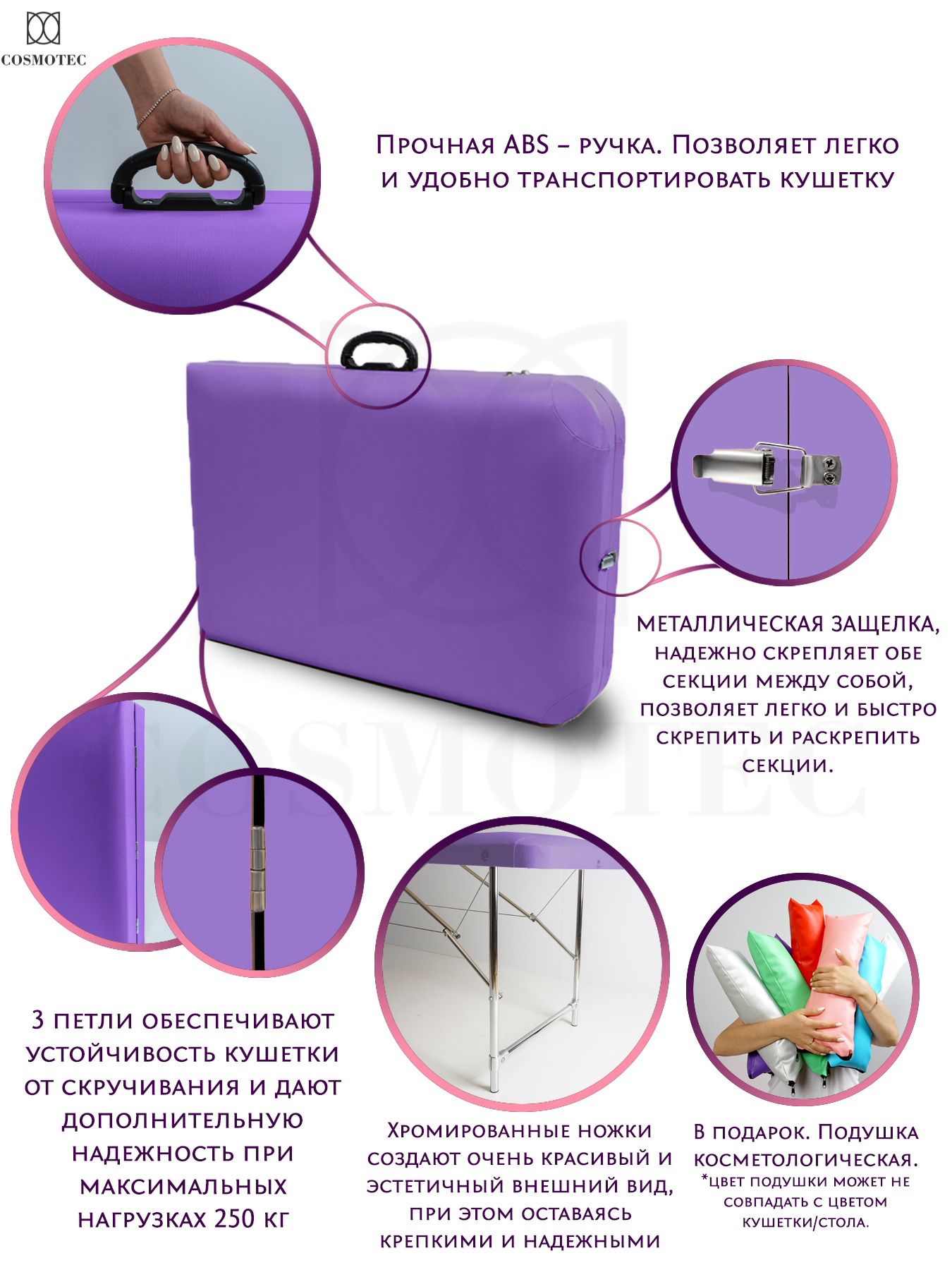 Массажная кушетка Cosmotec Косметик 190Р, с регулировкой высоты, Фиолетовая