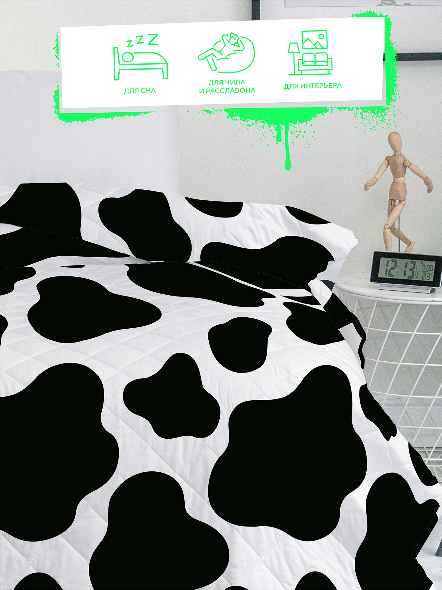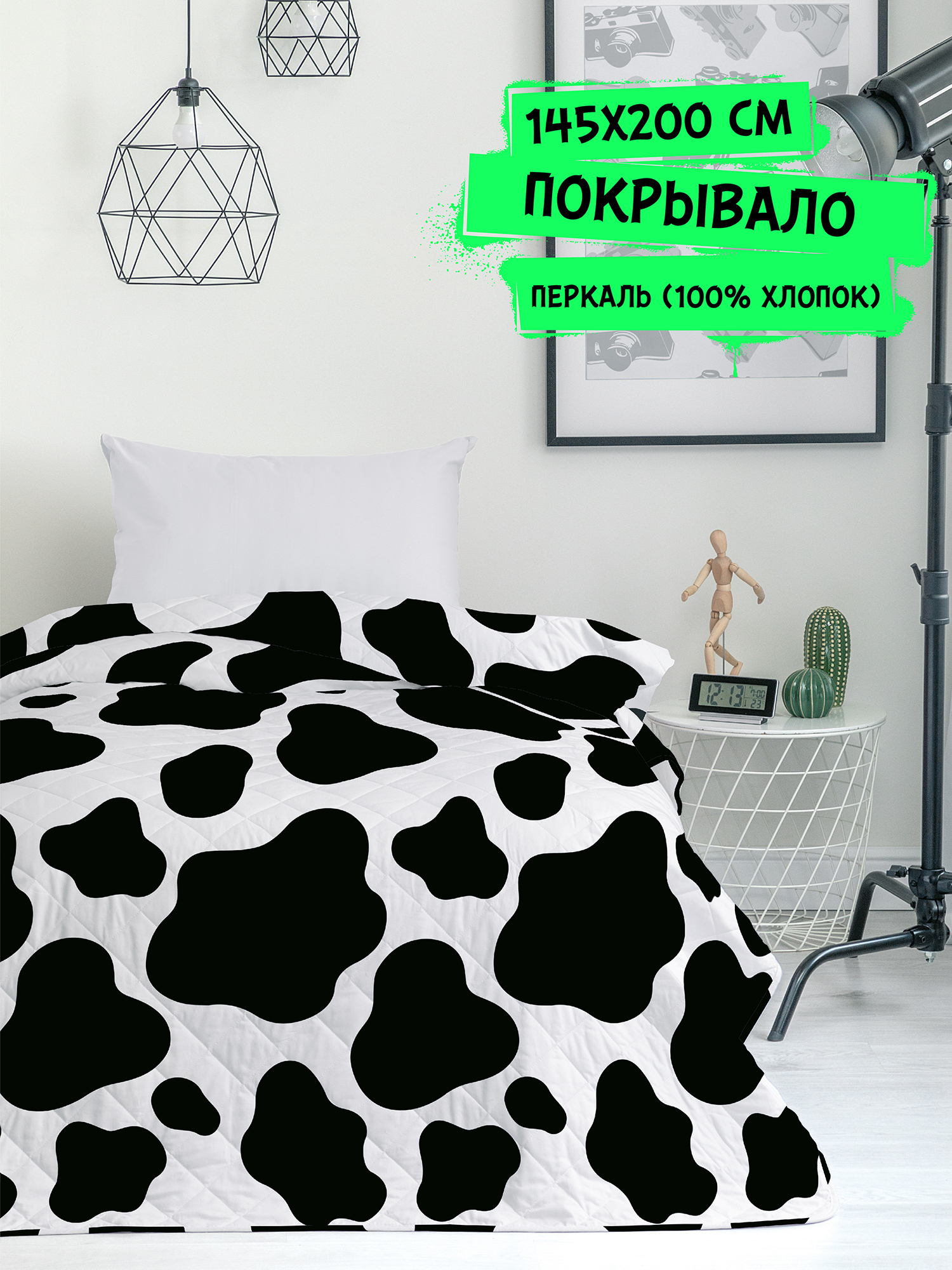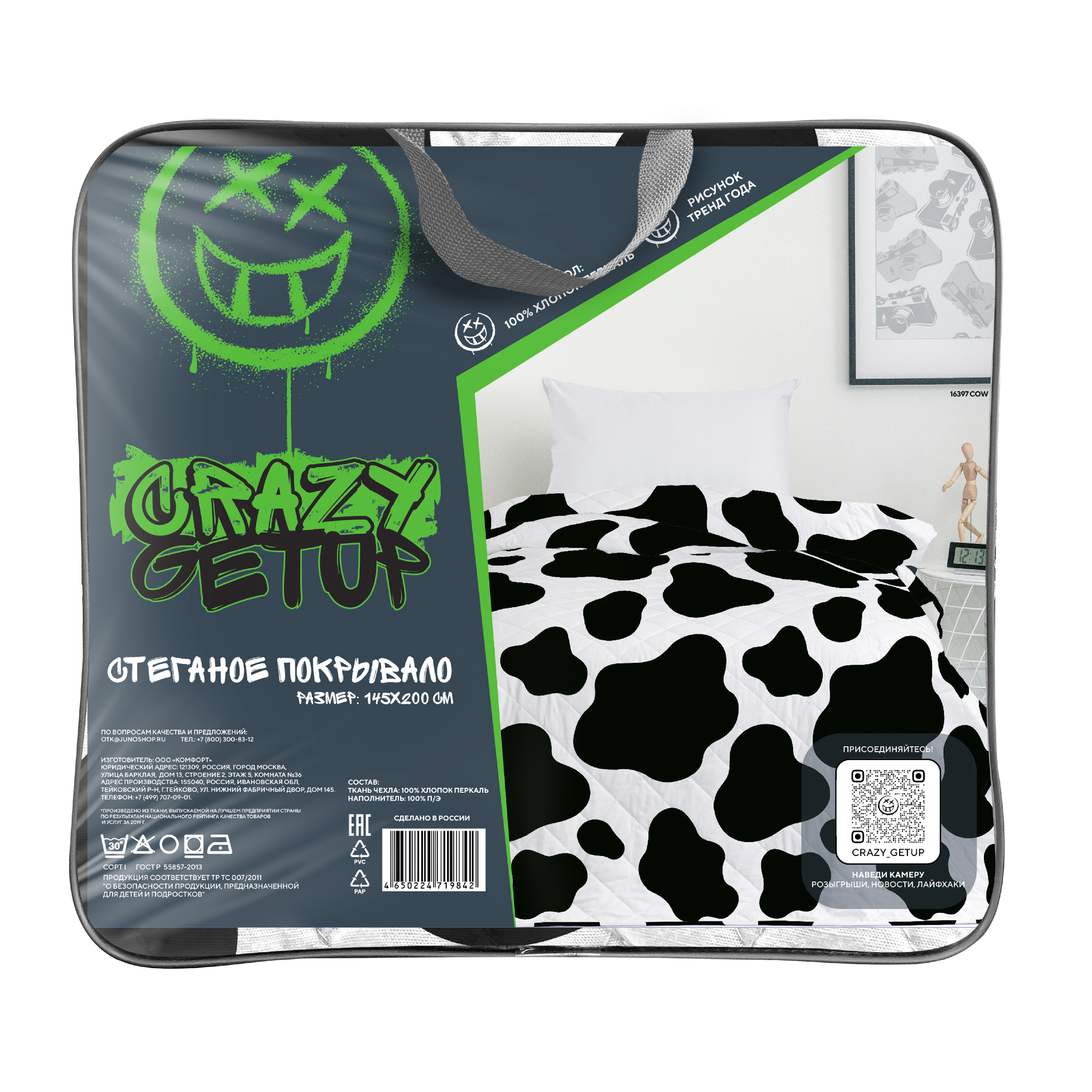 Полутороспальное стеганое покрывало / 1,5 спальное / подростковое, детское/ на кровать / для детей / для подростков / 100% Хлопок "Crazy Getup" 145х200 см Корова / Cow
