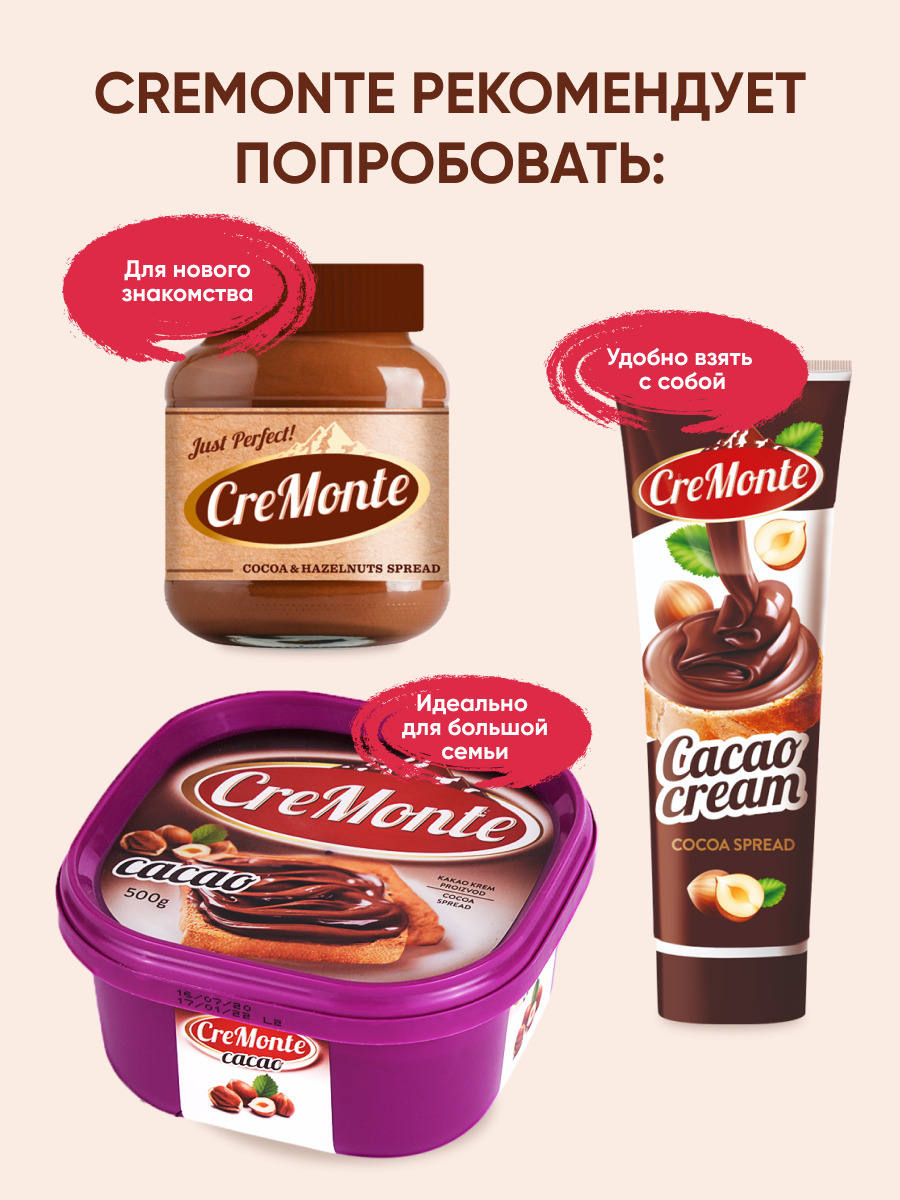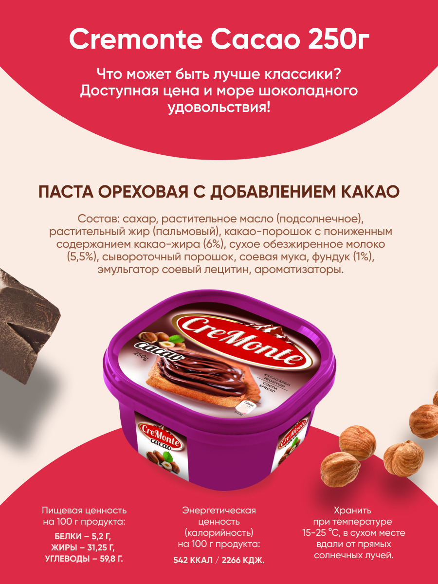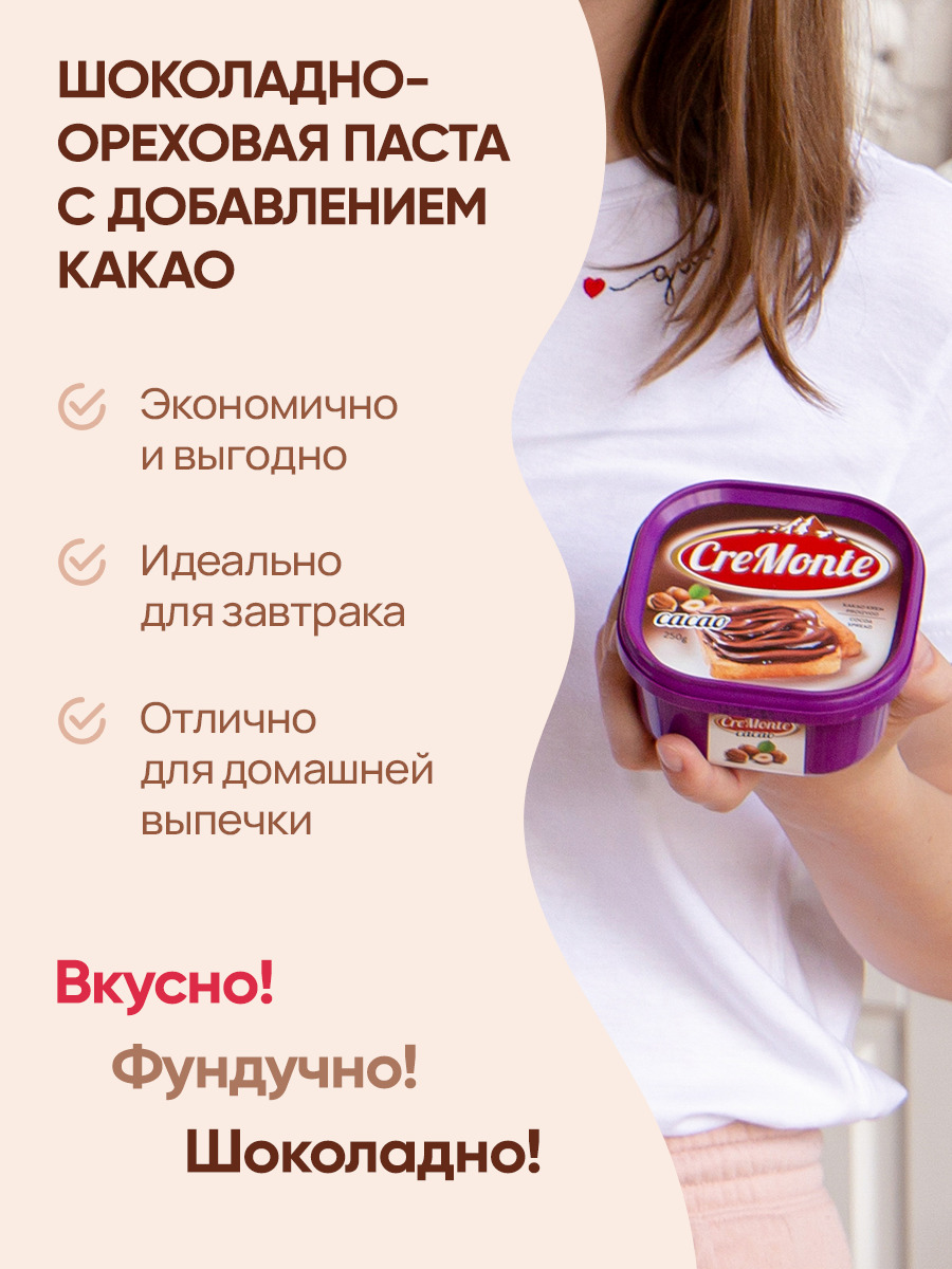 Паста орехово-шоколадная CreMonte Cacao с добавлением какао, 250 г