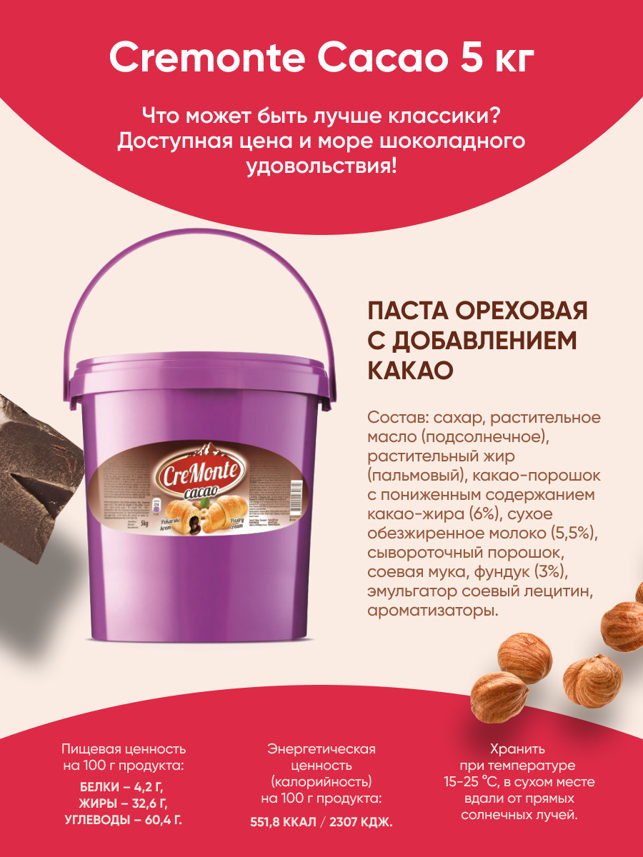 Паста орехово-шоколадная CreMonte Cacao с добавлением какао, 5 кг
