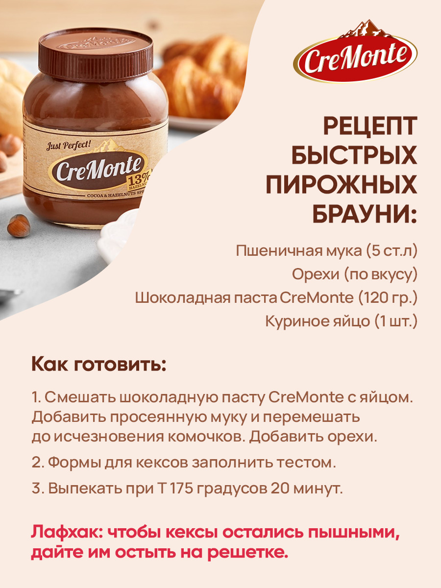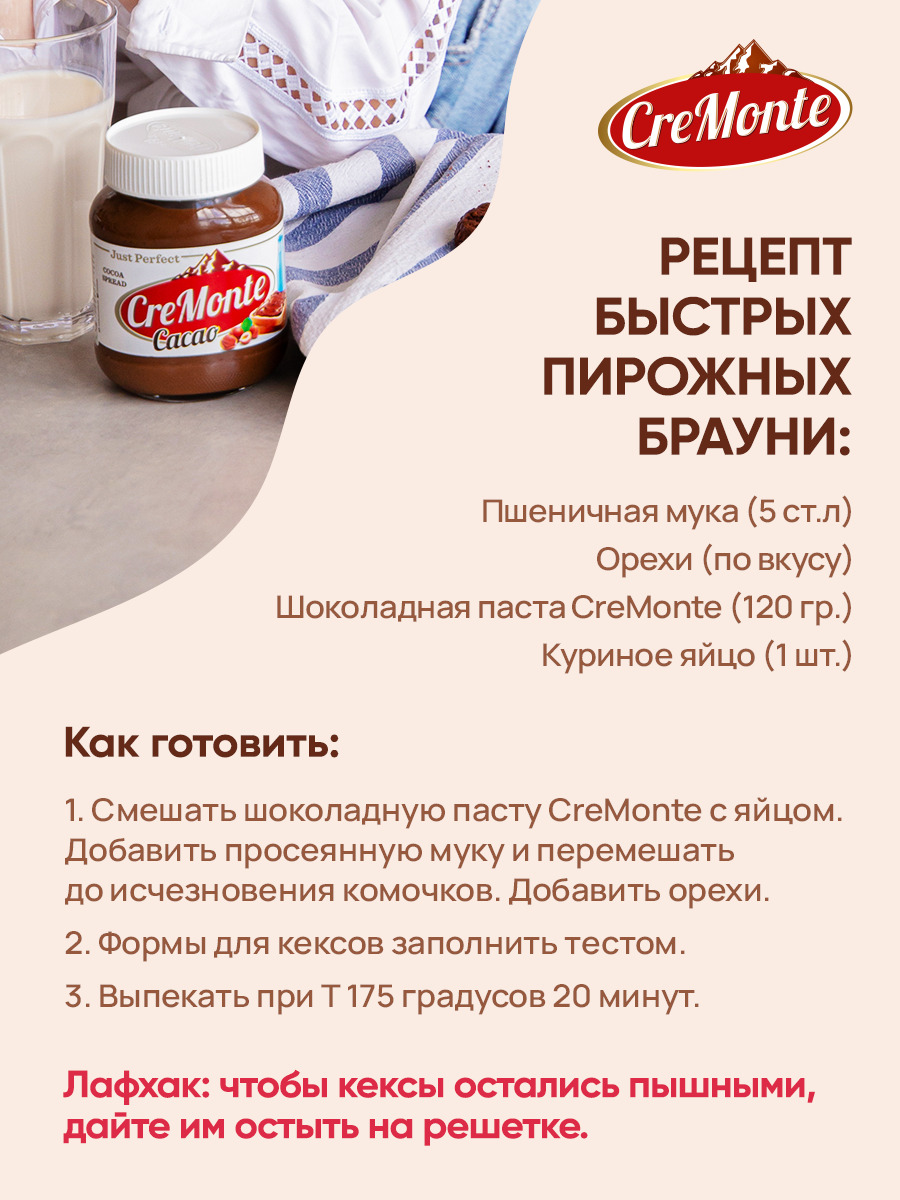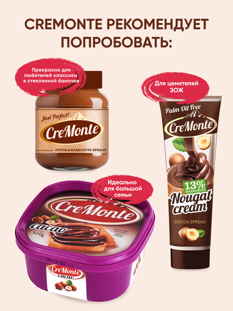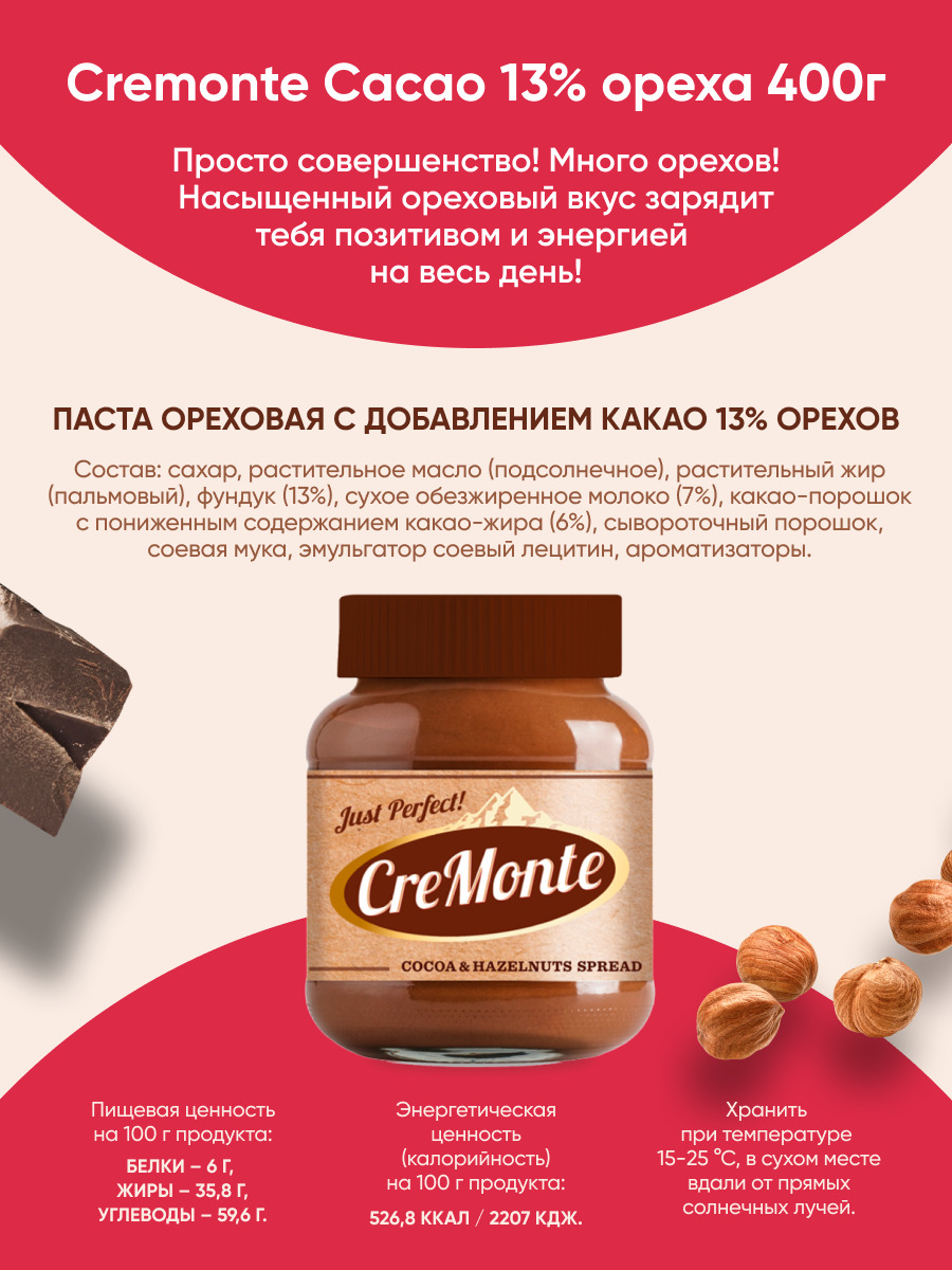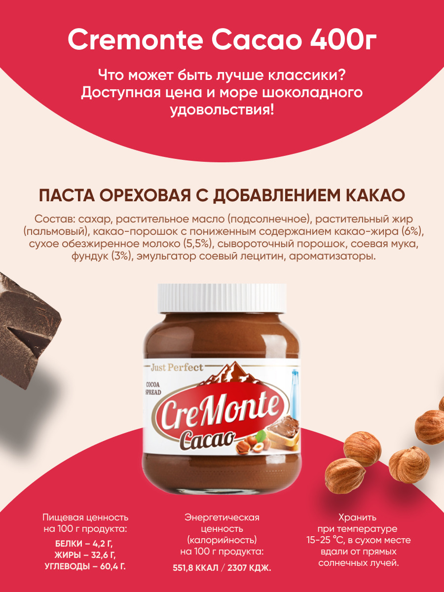 Паста орехово-шоколадная CreMonte Cacao с добавлением какао банка стеклянная, 400 г