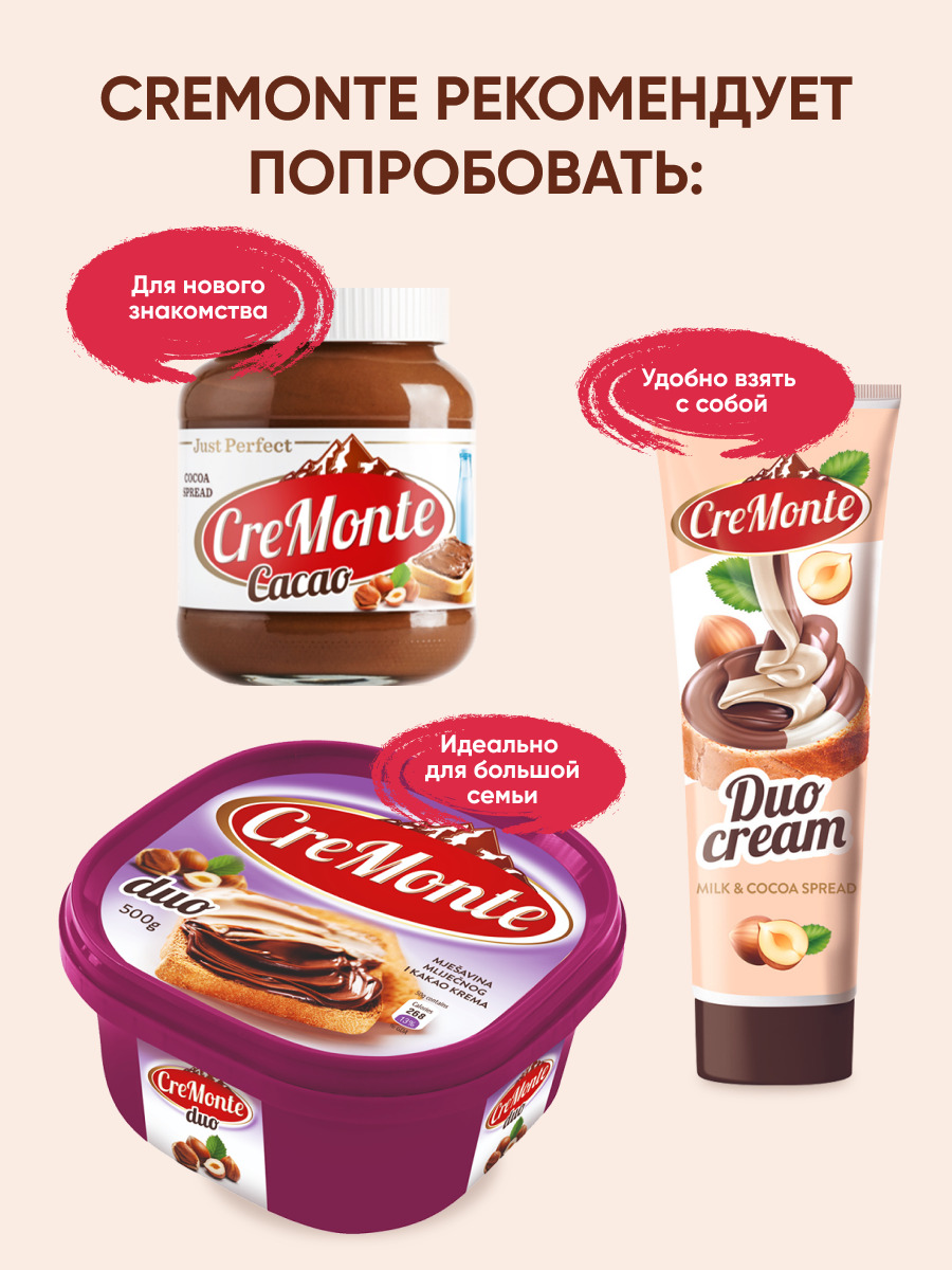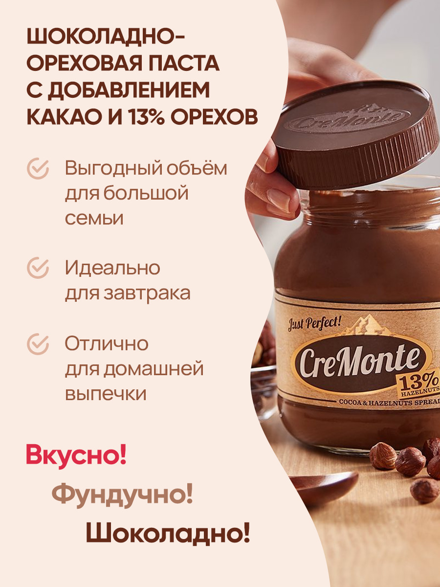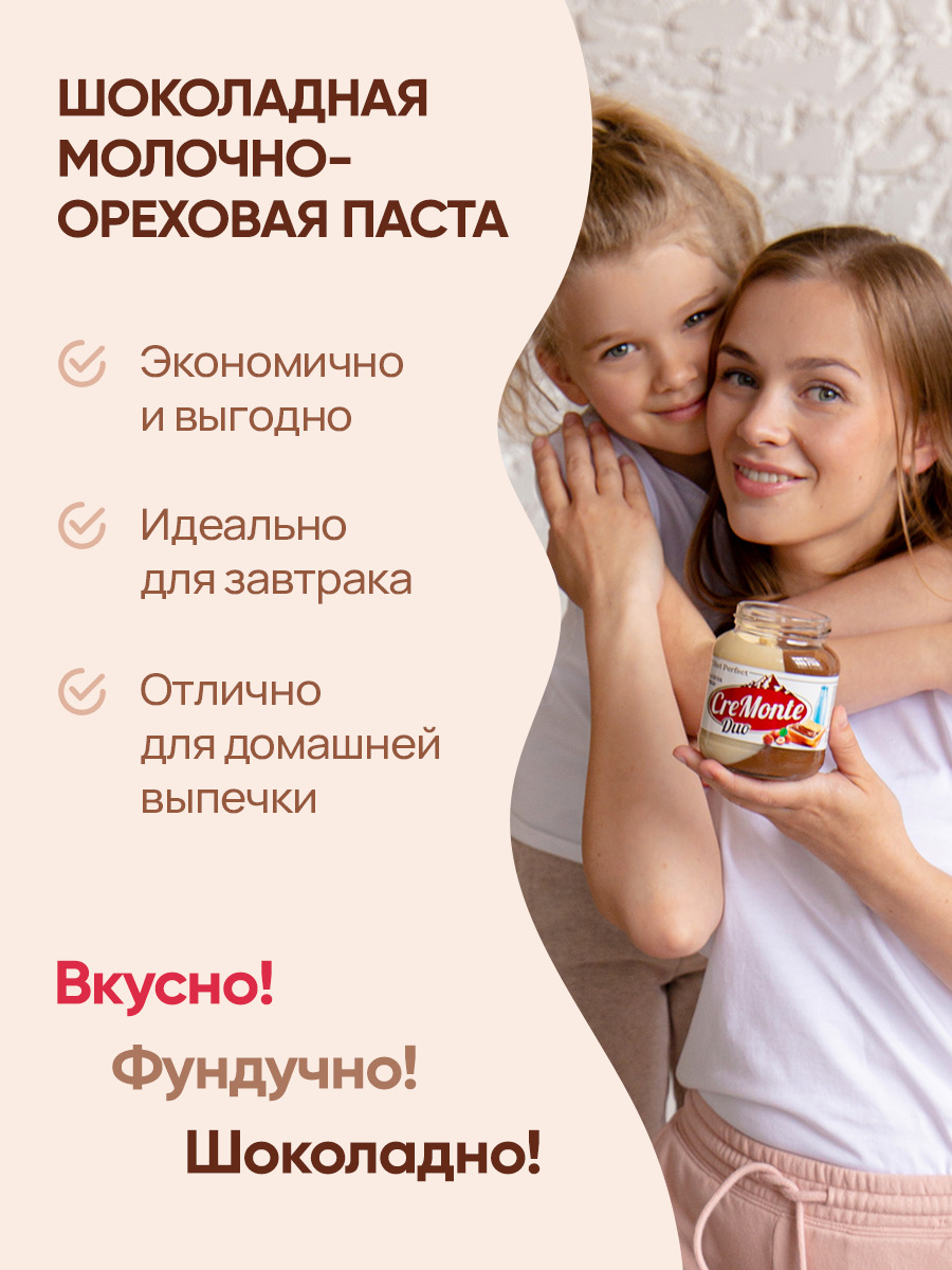 Паста шоколадная молочно-ореховая CreMonte Duo с добавлением какао, 500 г