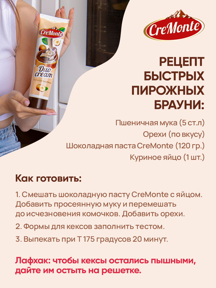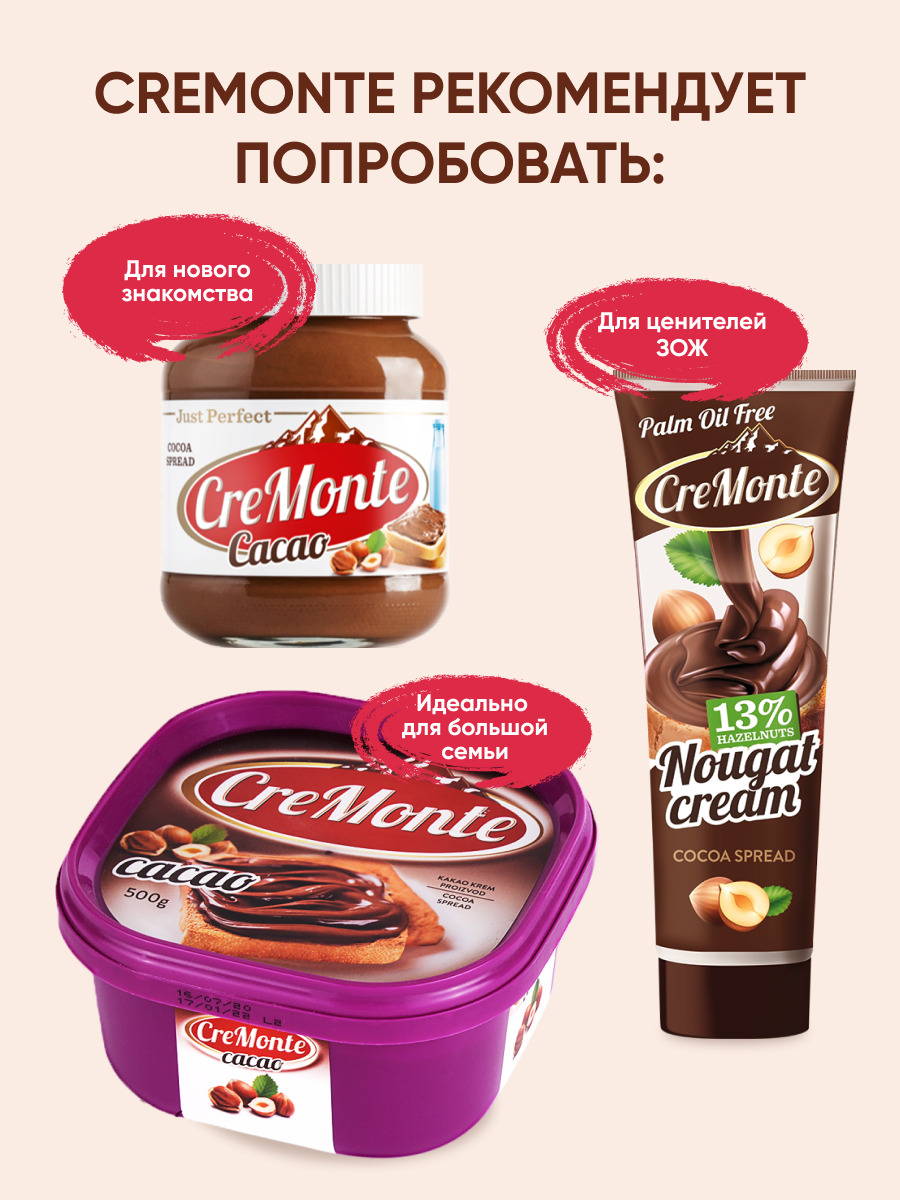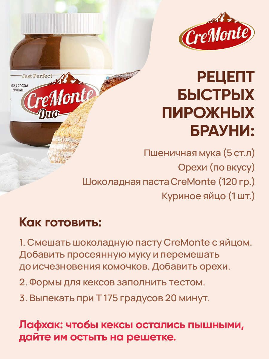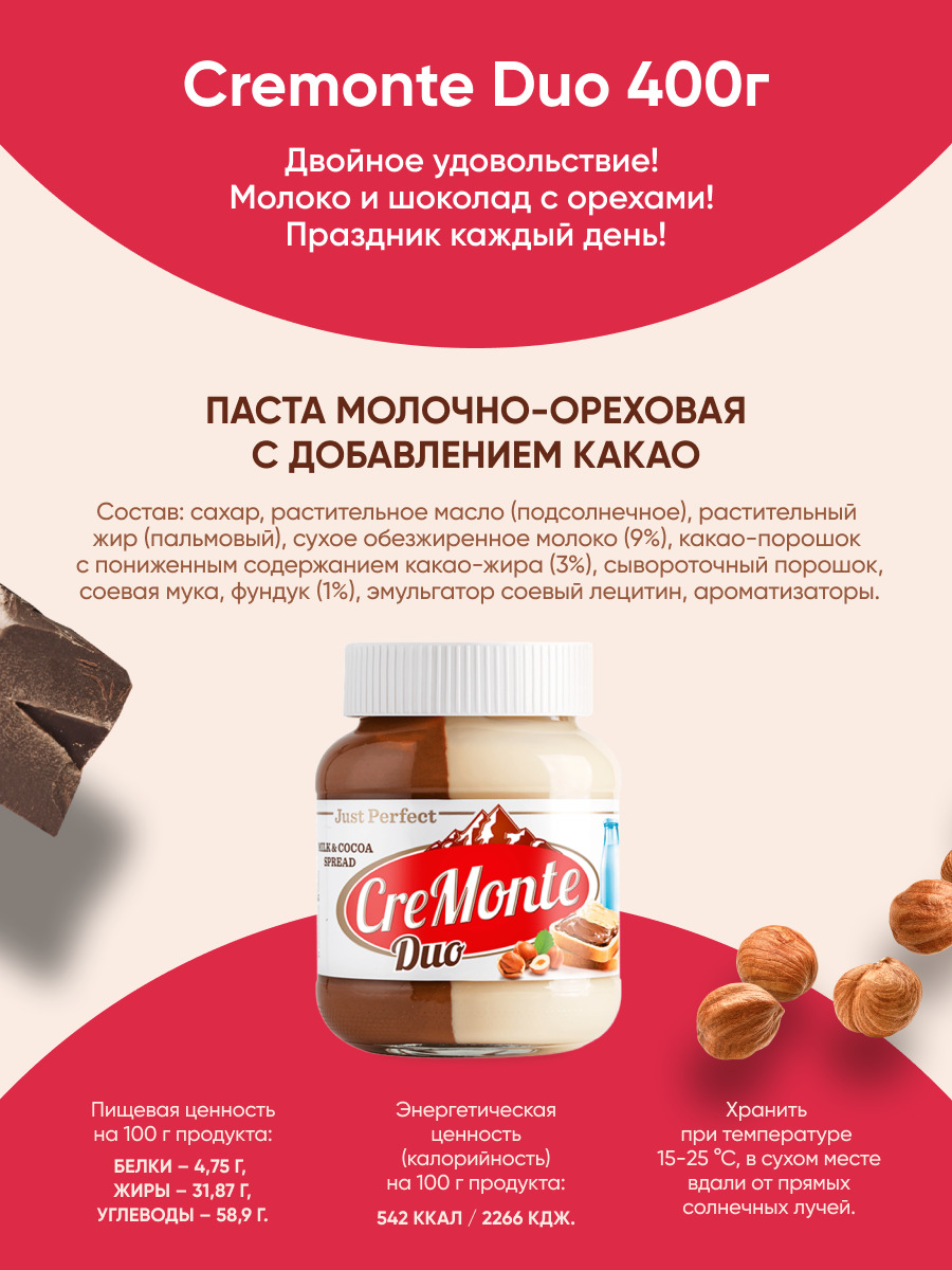 Паста шоколадная молочно-ореховая CreMonte Duo с добавлением какао, 500 г